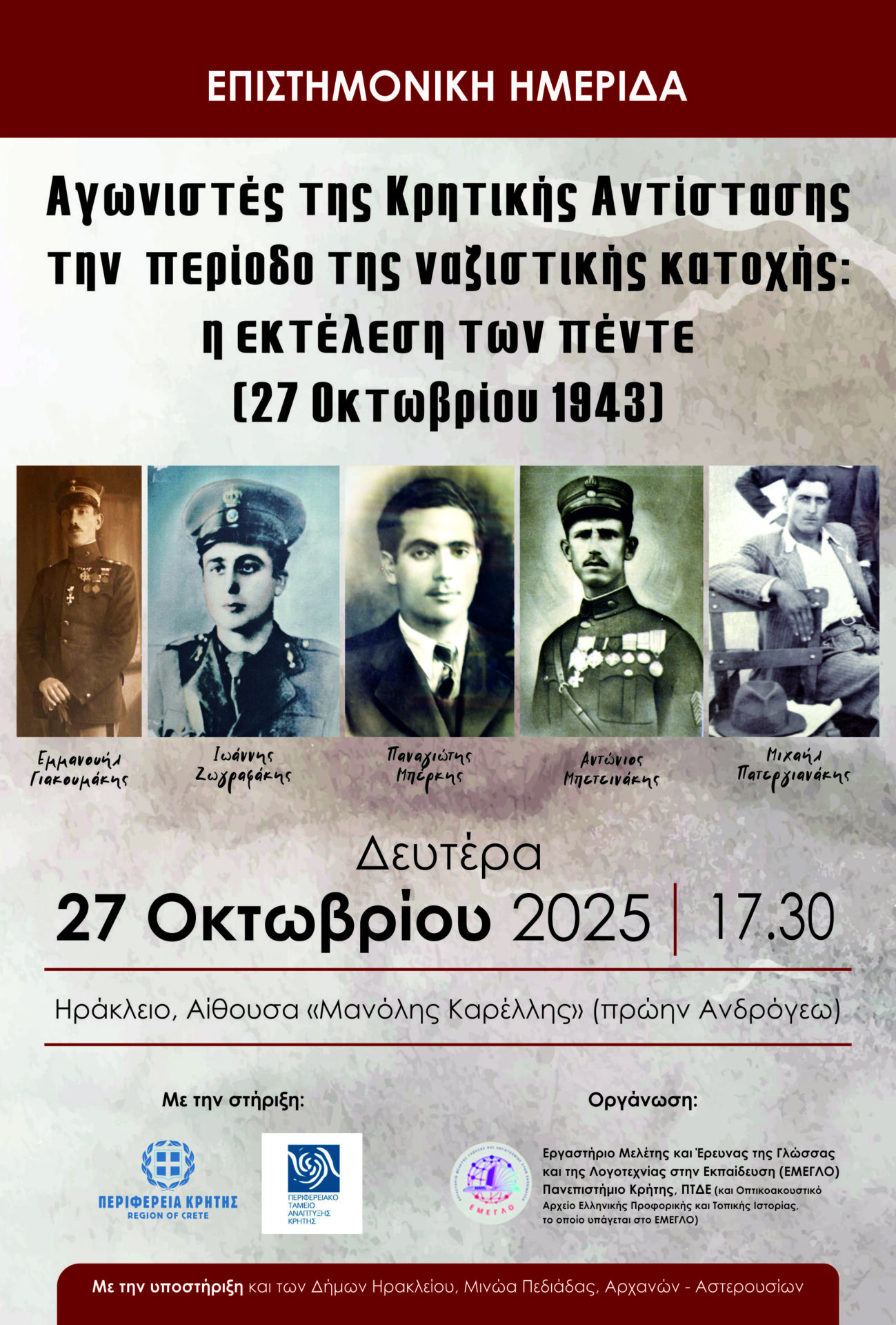 Τέλος, τη Δευτέρα 27 Οκτωβρίου, στις 5:30 μ.μ., θα πραγματοποιηθεί στο Ηράκλειο, στην Αίθουσα «Μανόλη Καρέλλη» (πρώην Ανδρόγεω), επιστημονική ημερίδα με θέμα: «Αγωνιστές της Κρητικής Αντίστασης την περίοδο της ναζιστικής κατοχής: Η εκτέλεση των πέντε (27 Οκτωβρίου 1943)». Η εκδήλωση διοργανώνεται από το Εργαστήριο Μελέτης και Έρευνας της Γλώσσας και της Λογοτεχνίας στην Εκπαίδευση (ΕΜΕΓΛΟ) και το Οπτικοακουστικό Αρχείο Ελληνικής Προφορικής και Τοπικής Ιστορίας του ΠΤΔΕ του Πανεπιστημίου Κρήτης, με τη στήριξη της Περιφέρειας Κρήτης, του Περιφερειακού Ταμείου Ανάπτυξης Κρήτης και των Δήμων Ηρακλείου, Μινώα Πεδιάδας και Αρχανών – Αστερουσίων.