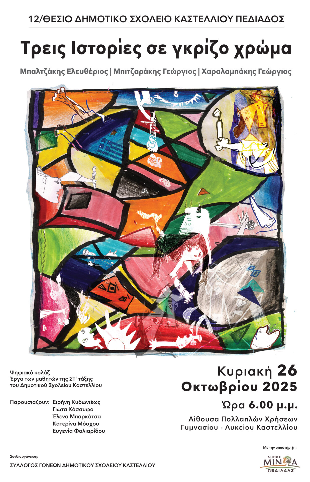 Διοργανώνεται από το Δημοτικό Σχολείο Καστελλίου και τον Σύλλογο Γονέων, με θέμα: «Τρεις Ιστορίες σε γκρίζο χρώμα. Μπαλτζάκης Ελευθέριος, Μπιτζαράκης Γεώργιος, Χαραλαμπάκης Γεώργιος».