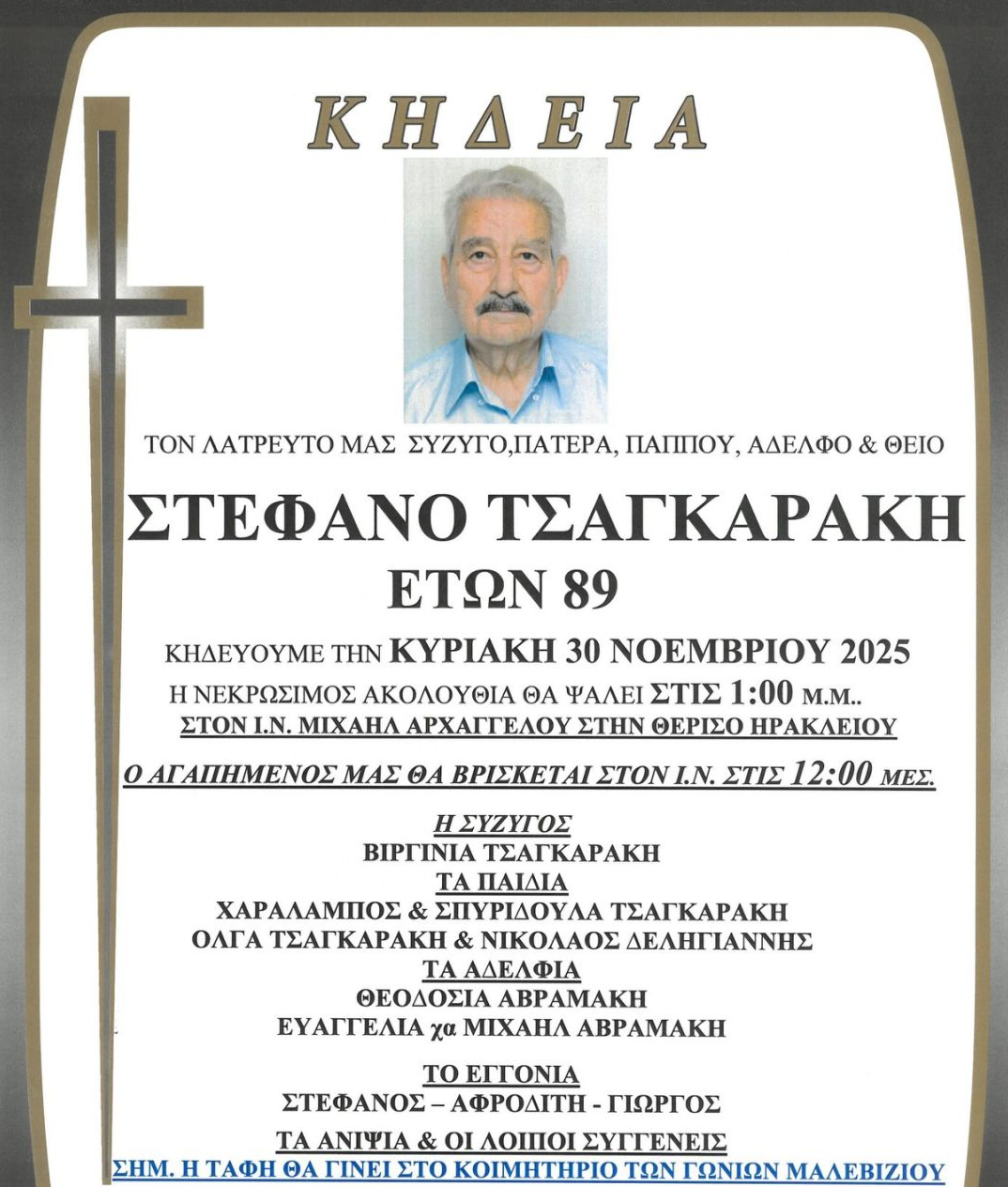 Στη θλίψη βυθίστηκε η τοπική κοινωνία του Ηρακλείου, μετά την είδηση θανάτου του Στέφανου Τσαγκαράκη, ο οποίος έφυγε από τη ζωή σε ηλικία 89 ετών.