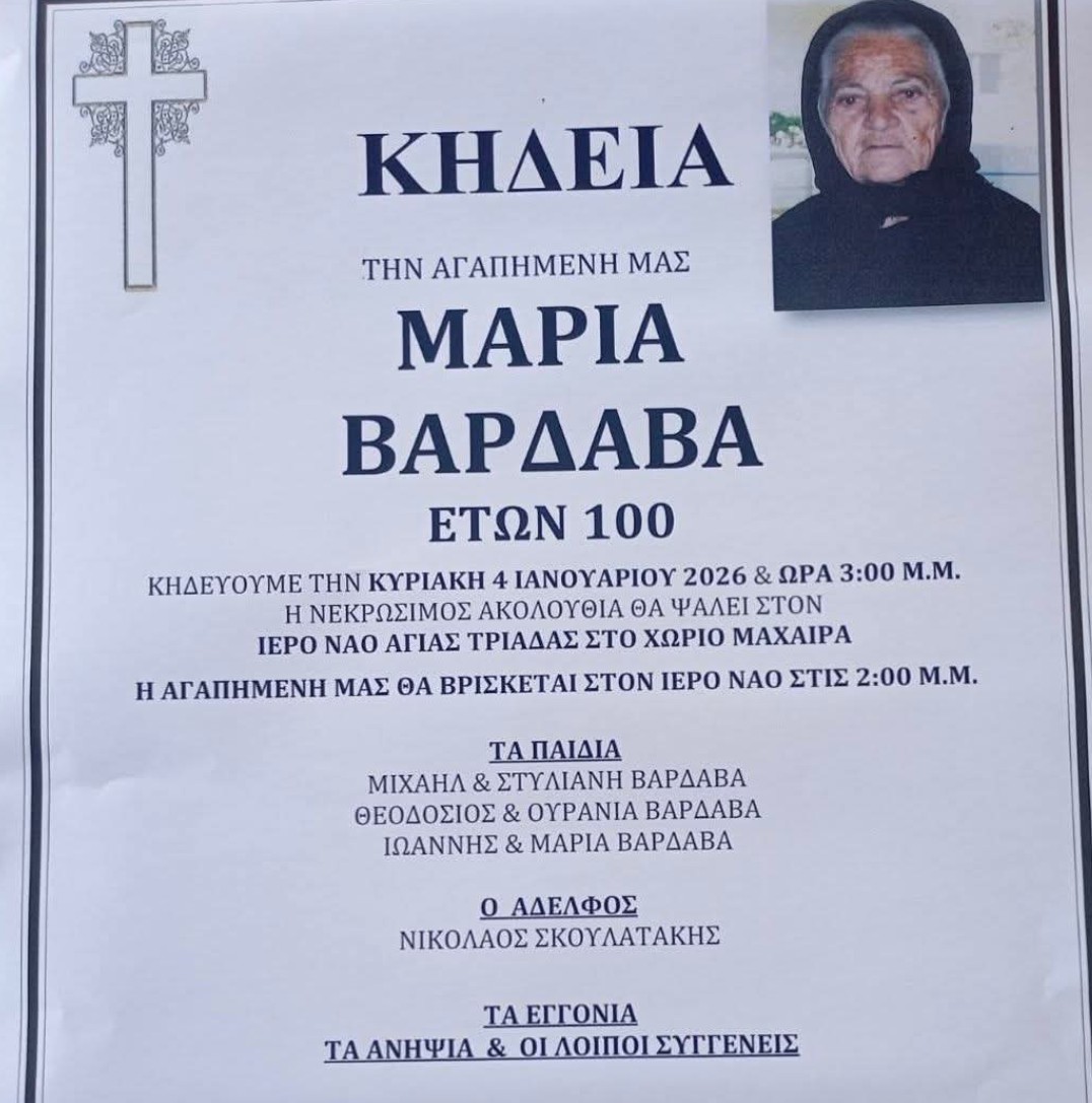 Μεγάλη θλίψη έχει προκαλέσει η είδηση του θανάτου της Μαρίας Βαρδαβά μητέρας του προέδρου του Λιμενικού Ταμείου Ηρακλείου και πρώην προέδρου του Οργανισμού Λιμένος Ηρακλείου Γιάννη Βαρδαβά που έφυγε από την ζωή σε ηλικία 100 ετών.