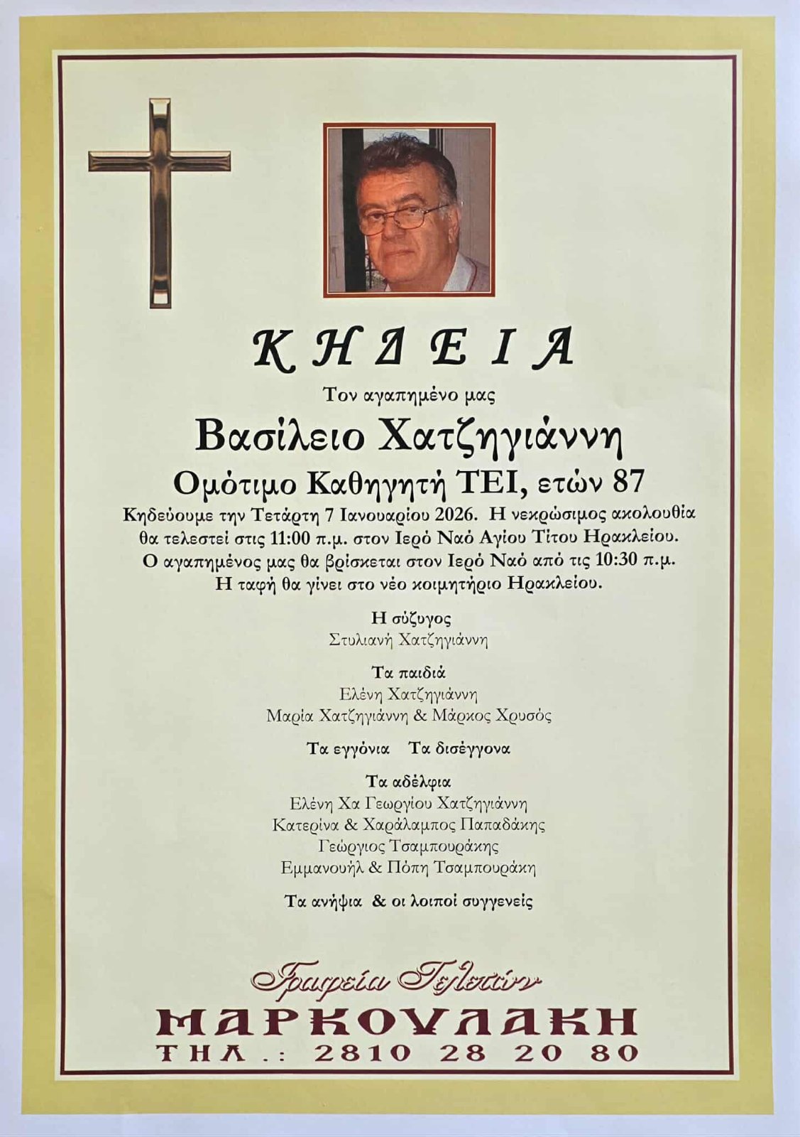 Στη θλίψη βυθίστηκε η ακαδημαϊκή κοινότητα, αλλά και στην τοπική κοινωνία του Ηρακλείου από την είδηση του θανάτου του ομότιμου Καθηγητή ΤΕΙ Βασίλειου Χατζηγιάννη, ο οποίος έφυγε από τη ζωή σε ηλικία 87 ετών.