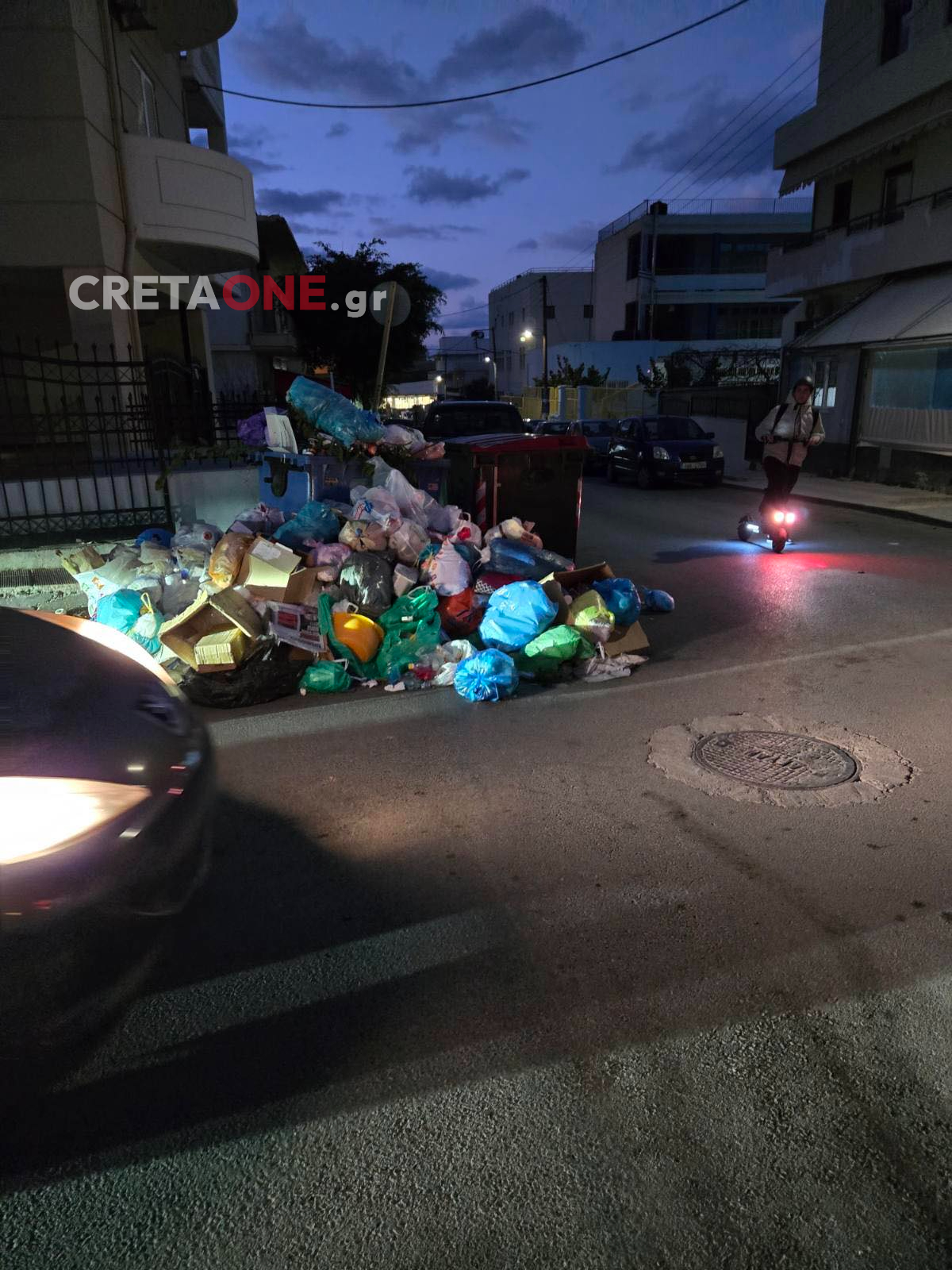 Σακούλες σκουπιδιών, χαρτόκουτες και κάθε είδους απορρίμματα έχουν σχηματίσει έναν σωρό που καταλαμβάνει μέρος του οδοστρώματος, δημιουργώντας σοβαρά προβλήματα στην κυκλοφορία και κινδύνους για τη δημόσια υγεία.