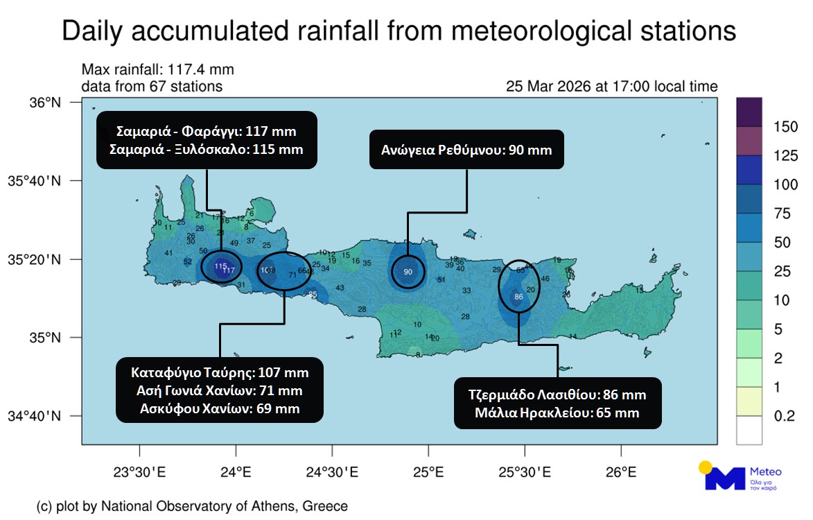 Σύμφωνα με χάρτη που αποτυπώνει τη γεωγραφική κατανομή του ημερήσιου ύψους βροχής έως τις 17:00, βάσει δεδομένων από 67 αυτόματους μετεωρολογικούς σταθμούς του Εθνικού Αστεροσκοπείου Αθηνών / Meteo.gr, τα μεγαλύτερα ύψη βροχόπτωσης καταγράφηκαν στο Φαράγγι Σαμαριάς και στο Ξυλόσκαλο Ομαλού.