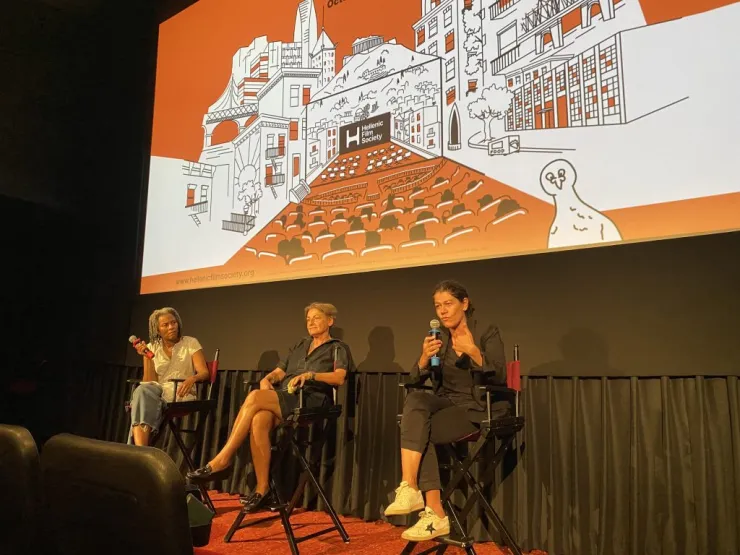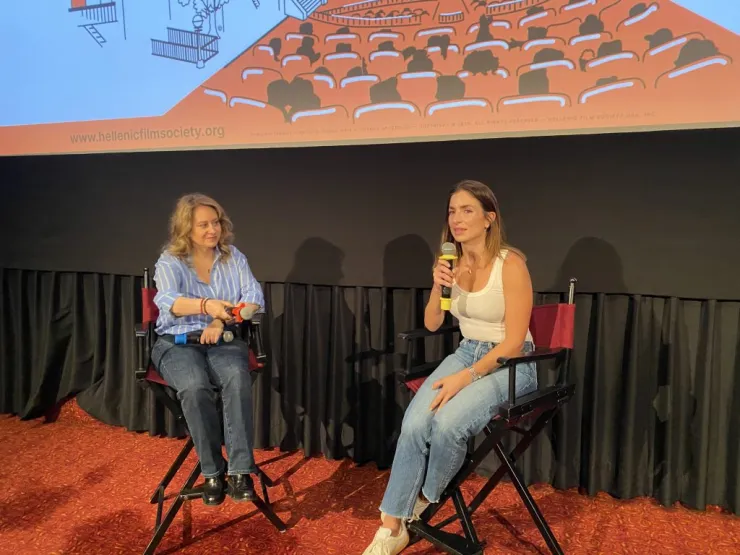 Η Πρόεδρος της Hellenic Film Society, Maria Miles, και η παραγωγός ταινιών Eleni Alafouzos κατά τη διάρκεια της συζήτησης Q&A μετά την προβολή του ντοκιμαντέρ «Takis» στη New York Greek Film Expo, στις 5 Οκτωβρίου. (Φωτογραφία: Eleni Sakellis/Εθνικός Κήρυκας)