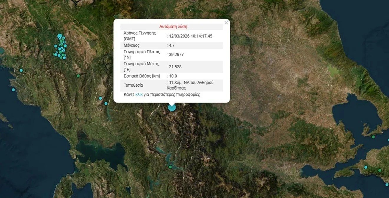 - Ισχυρός σεισμός 4,7 Ρίχτερ σημειώθηκε στην Καρδίτσα το μεσημέρι της Πέμπτης.