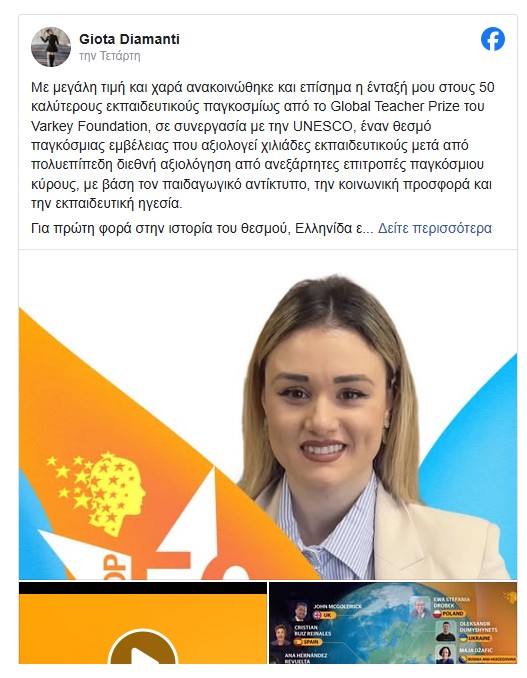 «Με μεγάλη τιμή και χαρά ανακοινώθηκε και επίσημα η ένταξή μου στους 50 καλύτερους εκπαιδευτικούς παγκοσμίως από το Global Teacher Prize του Varkey Foundation, σε συνεργασία με την UNESCO, έναν θεσμό παγκόσμιας εμβέλειας που αξιολογεί χιλιάδες εκπαιδευτικούς μετά από πολυεπίπεδη διεθνή αξιολόγηση από ανεξάρτητες επιτροπές παγκόσμιου κύρους, με βάση τον παιδαγωγικό αντίκτυπο, την κοινωνική προσφορά και την εκπαιδευτική ηγεσία.