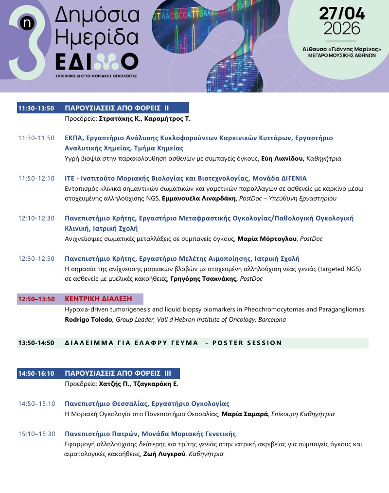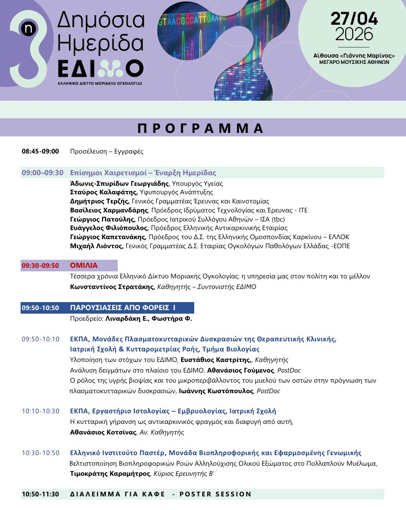 Τη Δευτέρα 27 Απριλίου 2026 στις 9:00 θα πραγματοποιηθεί η εκδήλωση για την ολοκλήρωση του τριετούς έργου «Ελληνικό Δίκτυο Μοριακής Ογκολογίας (ΕΔΙΜΟ)».