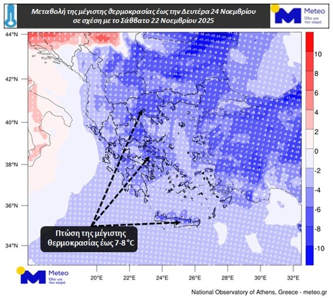 Όπως φαίνεται σε αυτόν, η συνολική πτώση στα ηπειρωτικά και στην Κρήτη θα φτάσει τοπικά τους 7-8 °C με αποτέλεσμα η θερμοκρασία τη Δευτέρα 24/11 να αναμένεται να μην ξεπεράσει τους 15-17 °C στα ηπειρωτικά και τις κεντρικές και βόρειες νησιωτικές περιοχές και τους 17-19 °C στις Κυκλάδες, στα Δωδεκάνησα και στην Κρήτη.