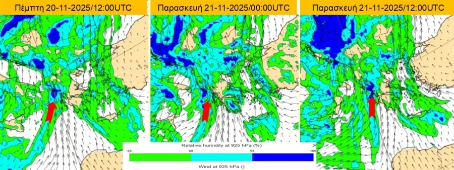 Αναλύσεις του ECMWF του πεδίου των ανέμων και της σχετικής υγρασίας στη στάθμη των 925 hPa. Η στάθμη αυτή βρίσκεται μερικές εκατοντάδες μέτρα πάνω από την επιφάνεια της θάλασσας. Σε μια τυπική ατμόσφαιρα το ύψος είναι περίπου 750 μέτρα, αλλά αυτό ποικίλλει ανάλογα με τη θερμοκρασία.