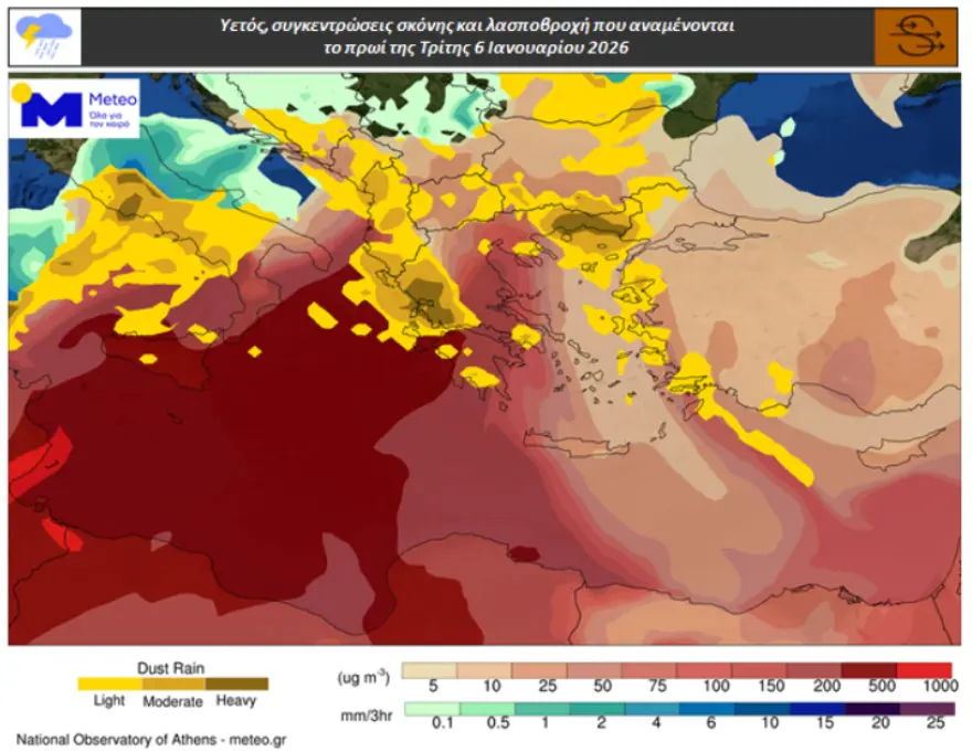 Στον χάρτη που ακολουθεί παρουσιάζονται ενδεικτικά με κίτρινο και καφέ χρώμα οι περιοχές που αναμένονται κατά τόπους λασποβροχές και αυξημένες συγκεντρώσεις αφρικανικής σκόνης το πρωί της Τρίτης 06/01.