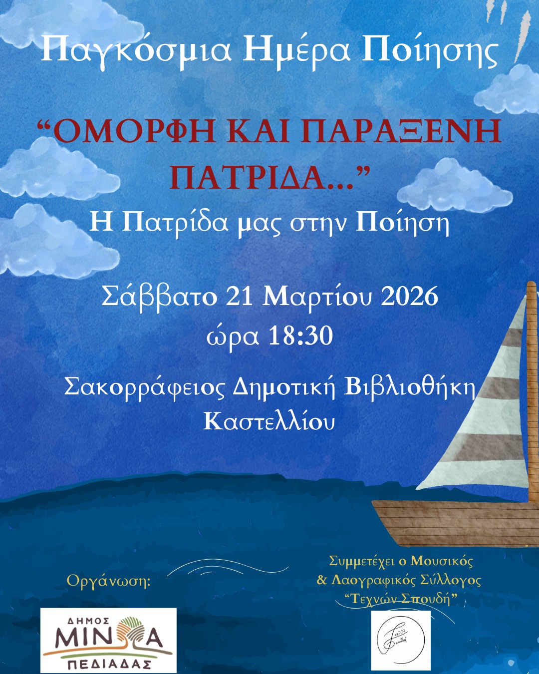 Ο Δήμος Μινώα Πεδιάδας σε συνεργασία με τη Σακορράφειο Βιβλιοθήκη, με αφορμή την Παγκόσμια Ημέρα Ποίησης, διοργανώνουν την εκδήλωση «Όμορφη και Παράξενη Πατρίδα: Η Πατρίδα μας στην ποίηση», το Σάββατο 21 Μαρτίου 2026 και ώρα 18:30, στο χώρο της Σακορράφειου Δημοτικής Βιβλιοθήκης.