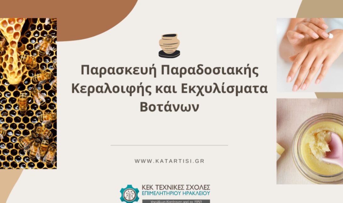 - Το ΚΕΚ του Επιμελητηρίου Ηρακλείου προσφέρει σεμινάριο παρασκευής κεραλοιφής και εκχυλισμάτων βοτάνων, με δυνατότητα δια ζώσης ή εξ’ αποστάσεως παρακολούθησης.