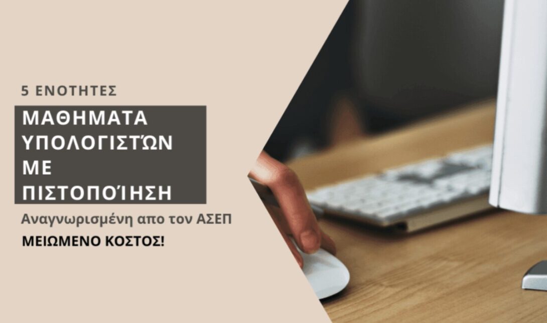 - - Τα μαθήματα υπολογιστών περιλαμβάνουν πέντε ενότητες και παρέχουν αναγνωρισμένη πιστοποίηση από τον ΑΣΕΠ και το Ελληνικό Δημόσιο.