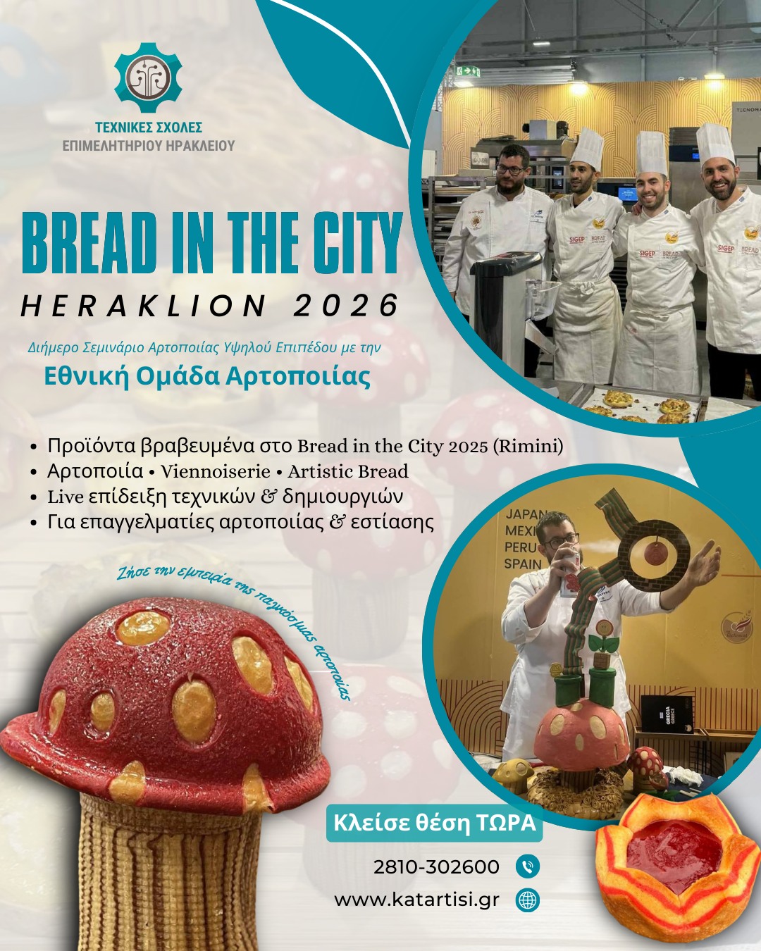 - Το σεμινάριο "BREAD IN THE CITY OF HERAKLION" προσφέρει διήμερη εκπαίδευση σε σύγχρονες αρτοποιητικές τεχνικές από την Εθνική Ομάδα Αρτοποιίας.