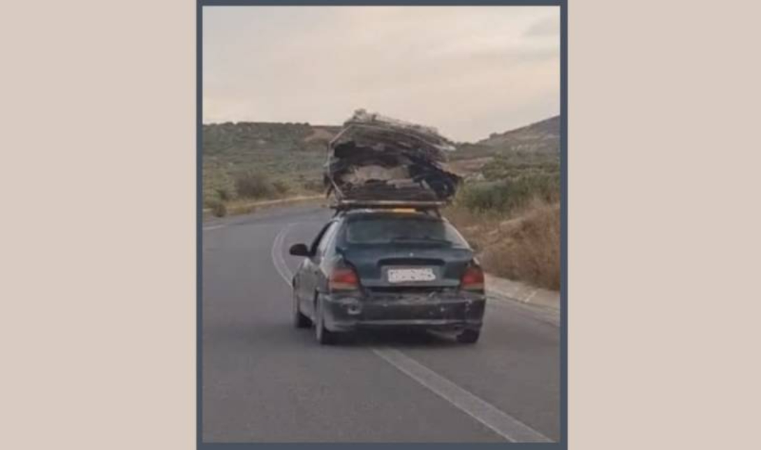 Ένα επικίνδυνο περιστατικό σημειώθηκε στο ύψος του Ινίου του Δήμου Βιάννου, όπου ένα ΙΧ κυκλοφορούσε με έναν τεράστιο και εμφανώς πρόχειρα δεμένο όγκο στην οροφή του, όπως αποτυπώνεται στη φωτογραφία του viannitika.gr.