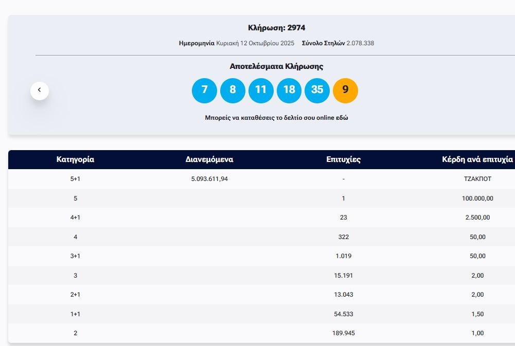 Πραγματοποιήθηκε το βράδυ της Κυριακής η κλήρωση του Τζόκερ με αριθμό 2974 που μοιράζει 5.000.000 ευρώ στους νικητές της πρώτης κατηγορίας.