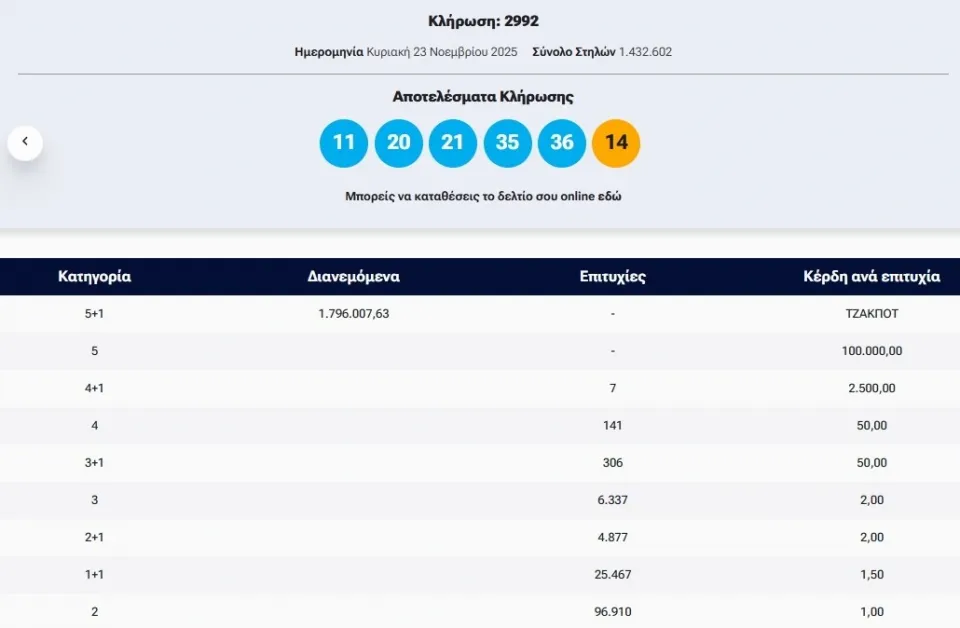 Πραγματοποιήθηκε το βράδυ της Κυριακής (23/11) η κλήρωση 2992 του Τζόκερ που μοιράζει στην πρώτη κατηγορία πάνω από 1,7 εκατομμύριο ευρώ.