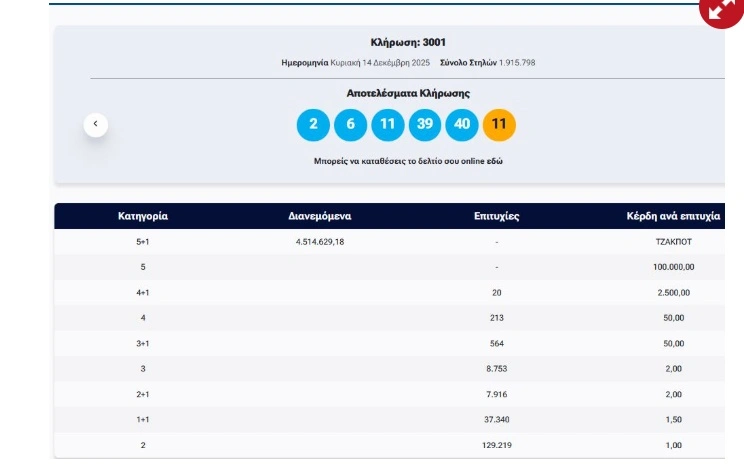 Πραγματοποιήθηκε το βράδυ της Κυριακής (14/12) η κλήρωση 3001 του Τζόκερ που μοιράζει στην πρώτη κατηγορία 4.514.629,18 ευρώ.