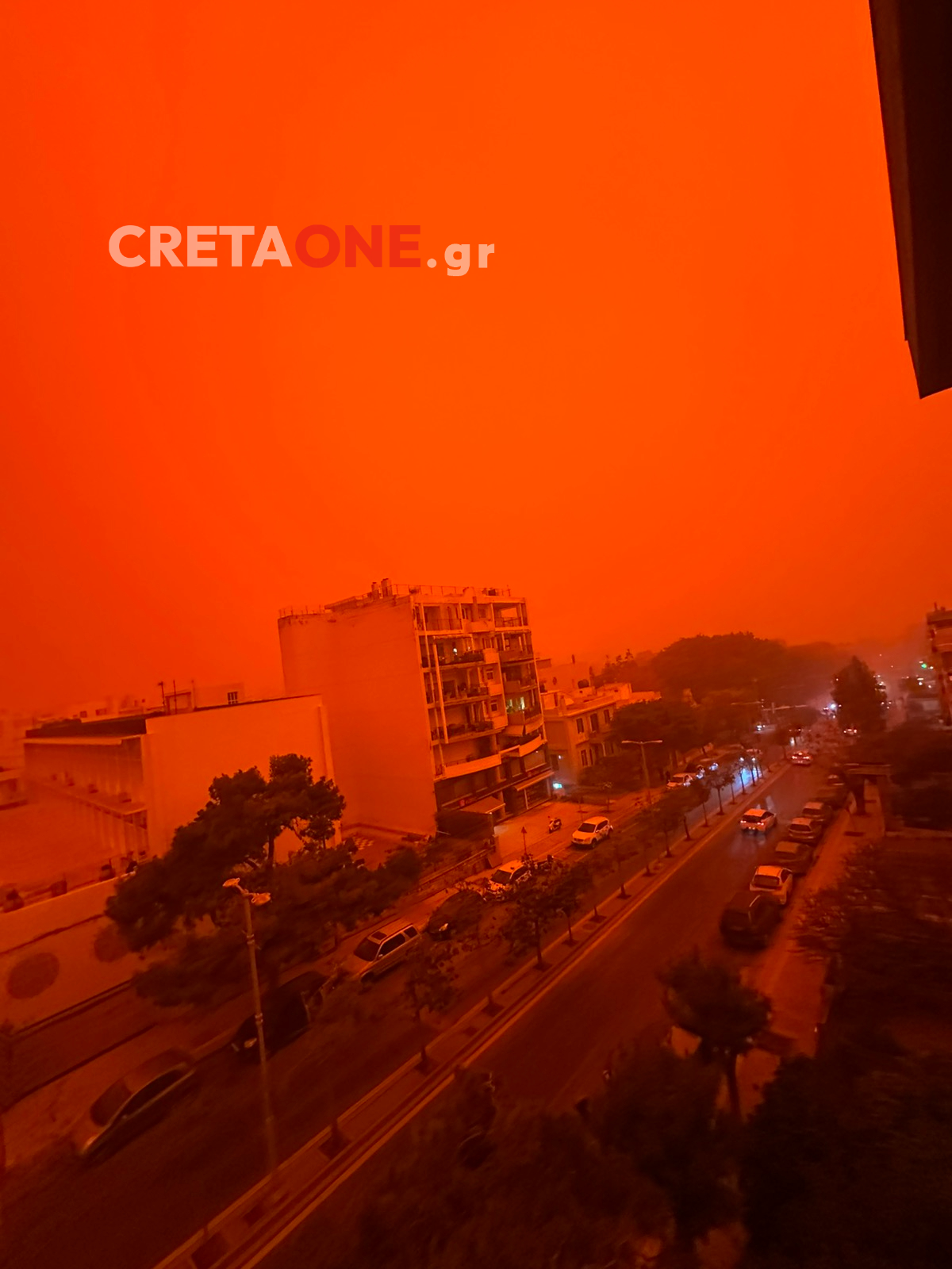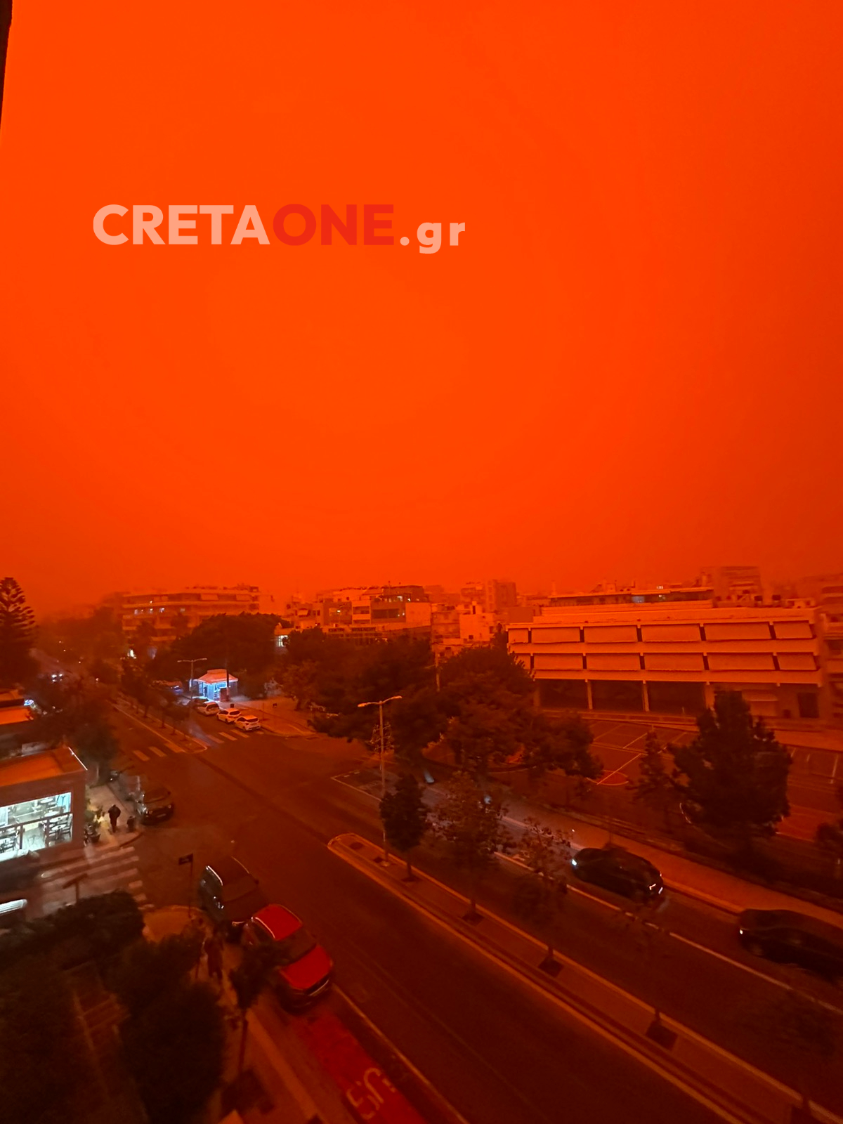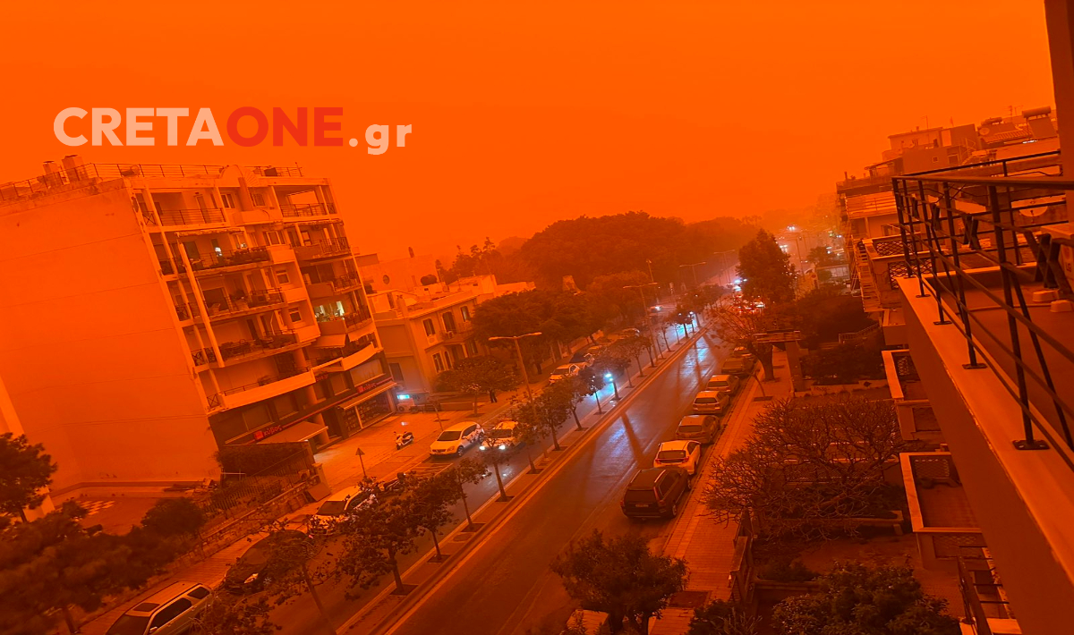 Κόκκινος έγινε ο ουρανός στο Ηράκλειο και συγκεκριμένα στη λεωφόρο Δημοκρατίας, εξαιτίας της έντονης μεταφοράς αφρικανικής σκόνης που έχει καλύψει την πόλη.