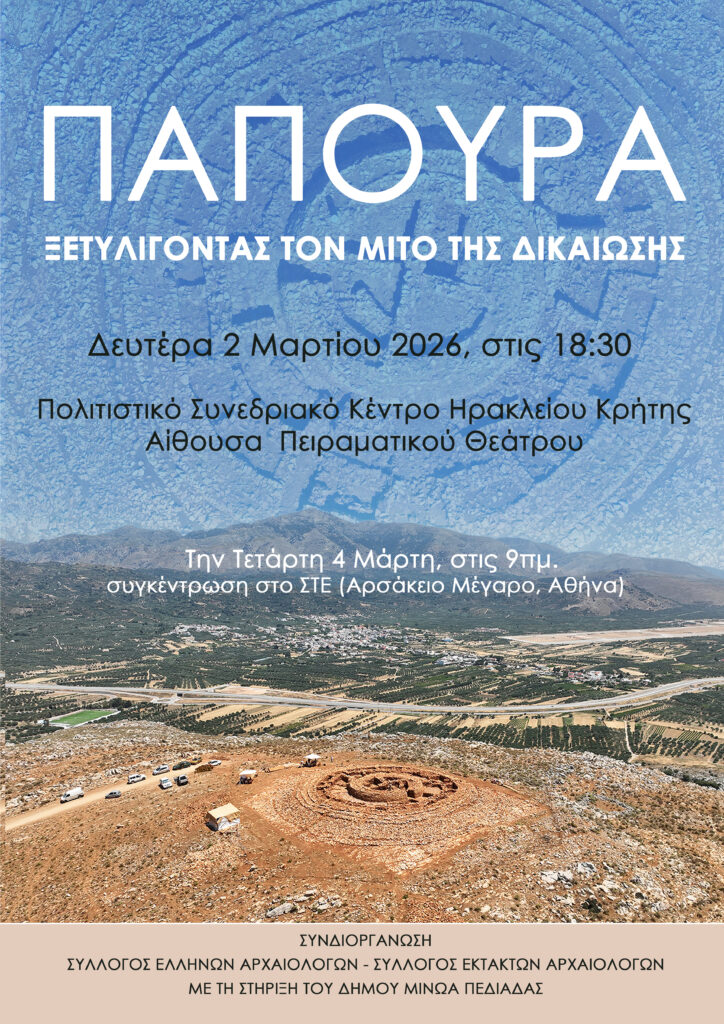Ενόψει της εκδίκασης, αύριο Δευτέρα 2/3/2026 έχει προγραμματιστεί στο Ηράκλειο μια σημαντική εκδήλωση με τίτλο “Παπούρα: Ξετυλίγοντας τον μίτο της δικαίωσης”. Η εκδήλωση θα φιλοξενηθεί στο Πολιτιστικό Κέντρο Ηρακλείου στις 18.30, όπου θα παρουσιαστούν τα δεδομένα της έρευνας για το μοναδικό μνημείο από τους ανασκαφείς.