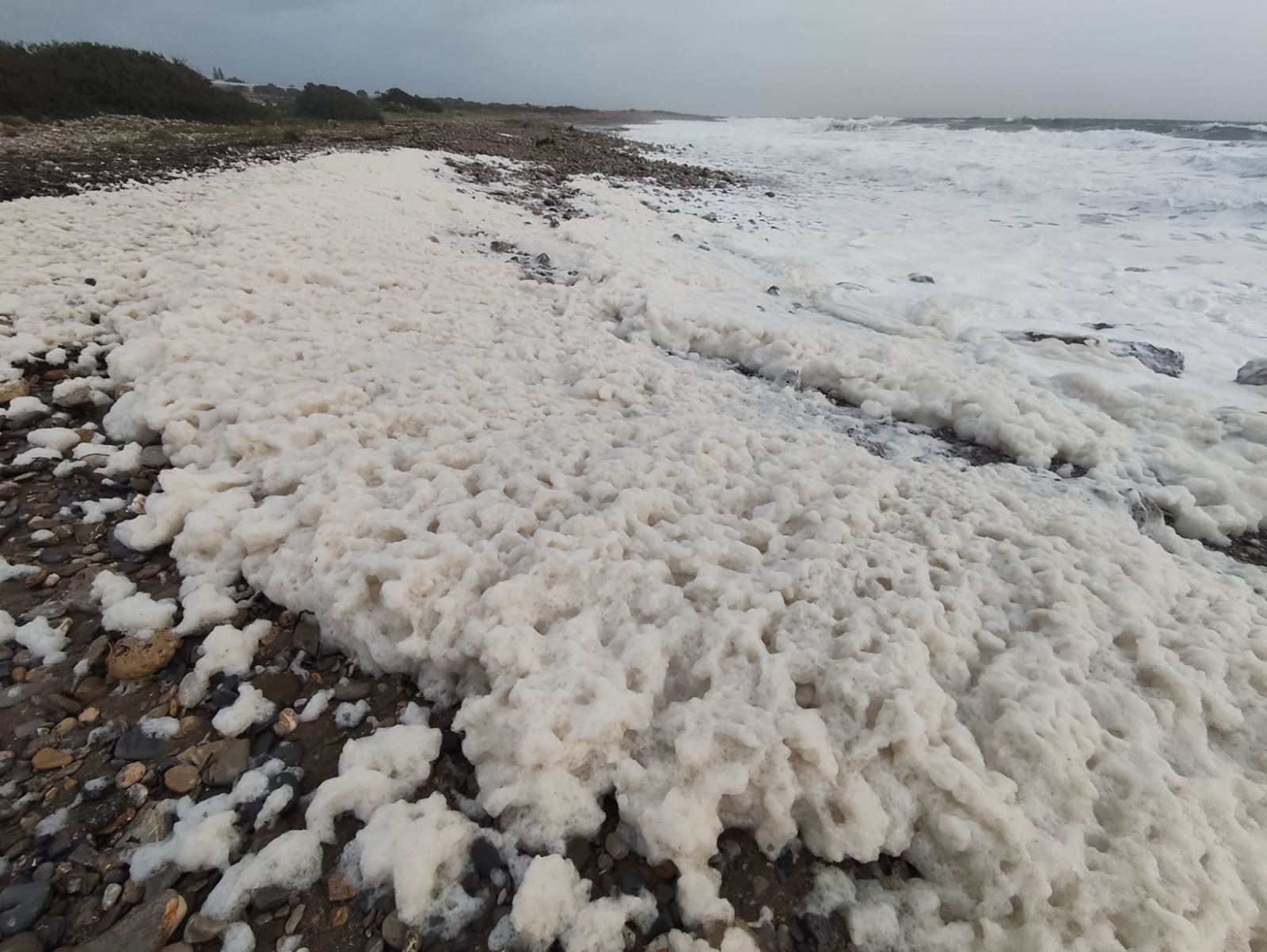 Τα μανιασμένα κύματα από τους θυελλώδεις ανέμους που έπνεαν στην περιοχή γέμισαν την ακτή με αφρό.