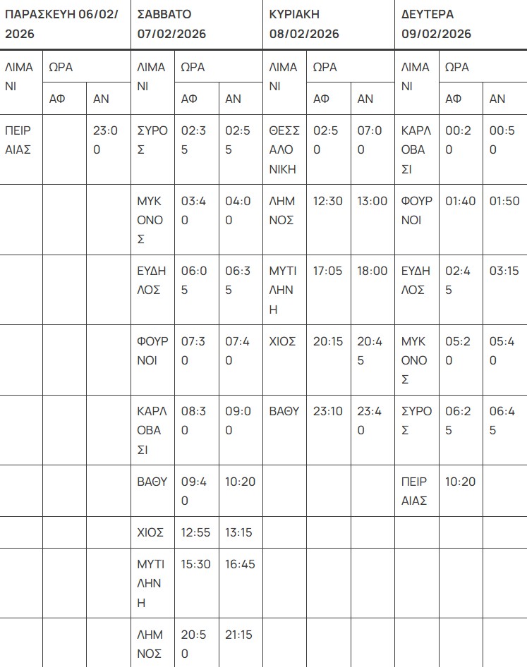 Συγκεκριμένα, όσον αφορά το πλοίο ΕΛΥΡΟΣ, την Παρασκευή 06/02 θα αναχωρήσει από Πειραιά στις 23:00, για: