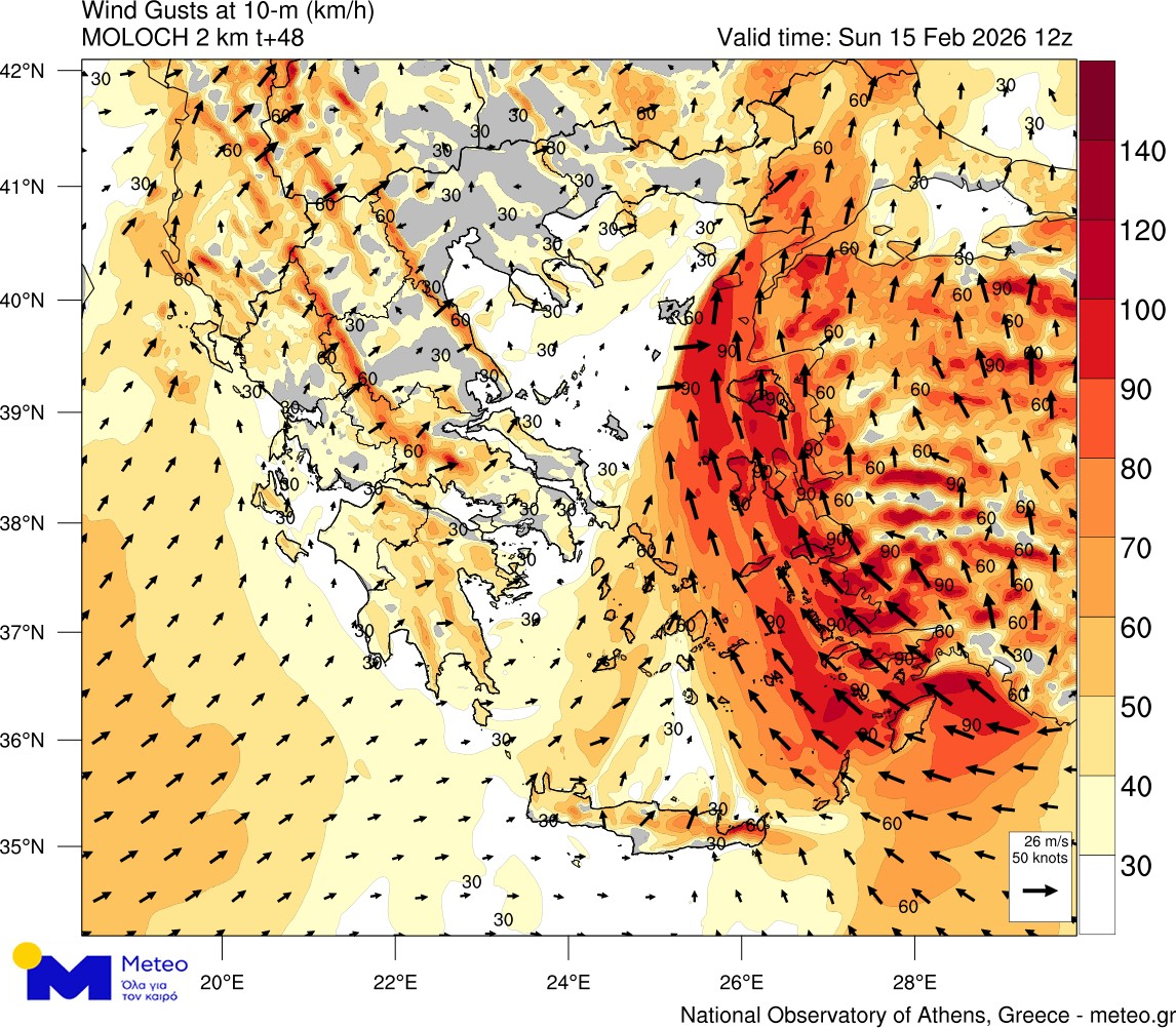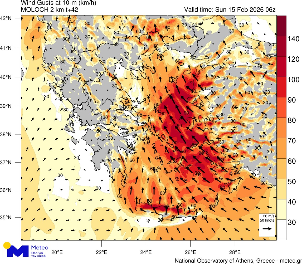 Σύμφωνα με τα νεότερα προγνωστικά στοιχεία του Εθνικού Αστεροσκοπείου Αθηνών / meteo.gr η διέλευση ενός βαρομετρικού χαμηλού από την περιοχή της Ιταλίας προς τα Νότια Βαλκάνια κατά τη διάρκεια της Κυριακής θα έχει ως αποτέλεσμα την σημαντική ενίσχυση των νότιων/νοτιοανατολικών ανέμων κυρίως στα πελάγη όπου η μέση ταχύτητα αναμένεται να φτάσει τα 7-8 μποφόρ, με ριπές ανέμου που κατά τόπους θα ξεπεράσουν τα 100-110 χλμ/ώρα. Σημειώνεται ότι οι ριπές του ανέμου αναμένεται να ισχυρές ακόμα και στη στεριά με έμφαση στη Κρήτη και στα υπόλοιπα νησιωτικά τμήματα του Αιγαίου όπως διακρίνεται και στην παρακάτω ομάδα χαρτών για τις πρωινές και μεσημβρινές ώρες της Κυριακής 15/02.