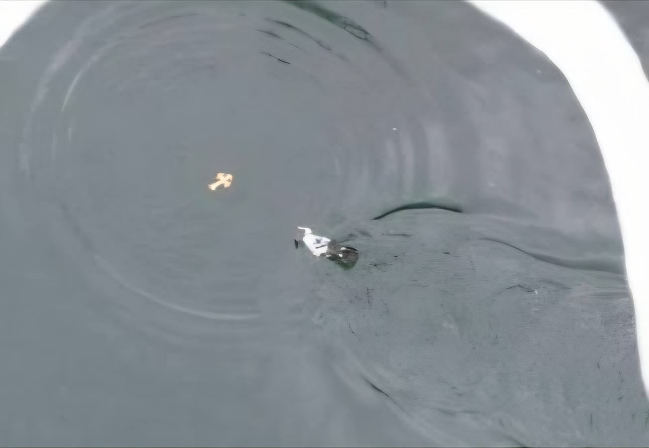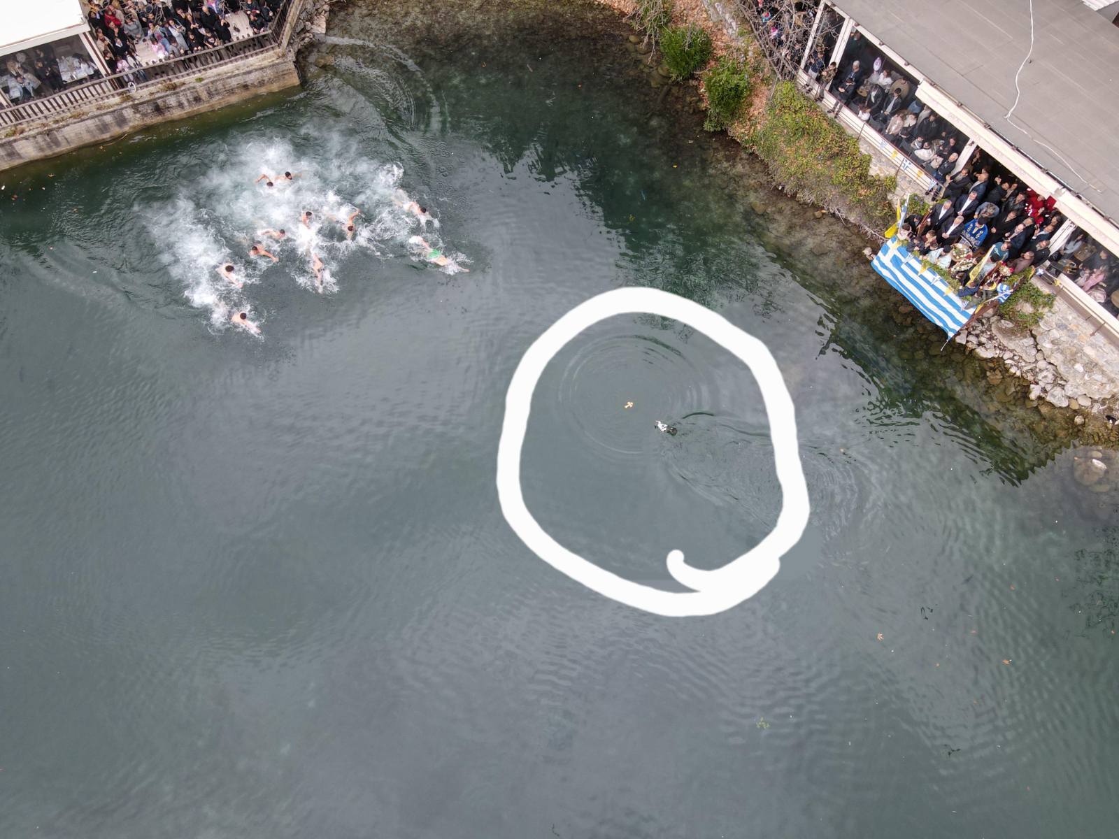 Όπως φαίνεται από τις εικόνες που κατέγραψε drone, πριν οι 11 βουτηχτές φτάσουν το σταυρό… τους πρόλαβε μια χήνα, μόνιμη κάτοικος της λίμνης που πιθανόν πίστεψε ότι έριξαν στο νερό κάτι βρώσιμο και έσπευσε «σπιντάτη» να το προσεγγίσει.