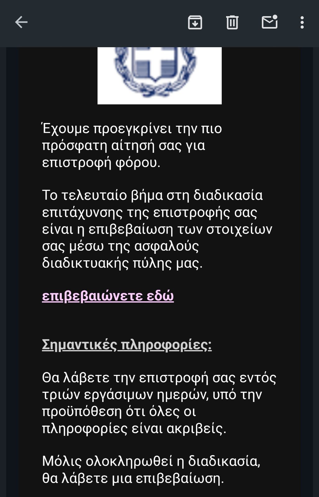 «Έχουμε προεγκρίνει την πιο πρόσφατη αίτησή σας για επιστροφή φόρου. Το τελευταίο βήμα στην διαδικασία επιτάχυνσης της επιστροφής σας είναι η επιβεβαίωση των στοιχείων σας μέσω της ασφαλούς διαδικτυακής πύλης μας: επιβεβαιώνετε εδώ….