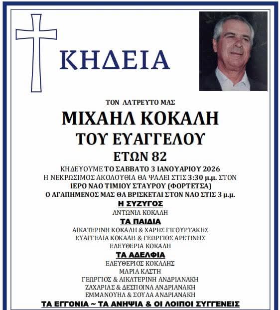 Η νεκρώσιμος ακολουθία θα ψαλεί το Σάββατο 3/1 στις 3:30 το μεσημέρι, στον ιερό ναό του Τιμίου Σταυρού (Φορτέτσα).