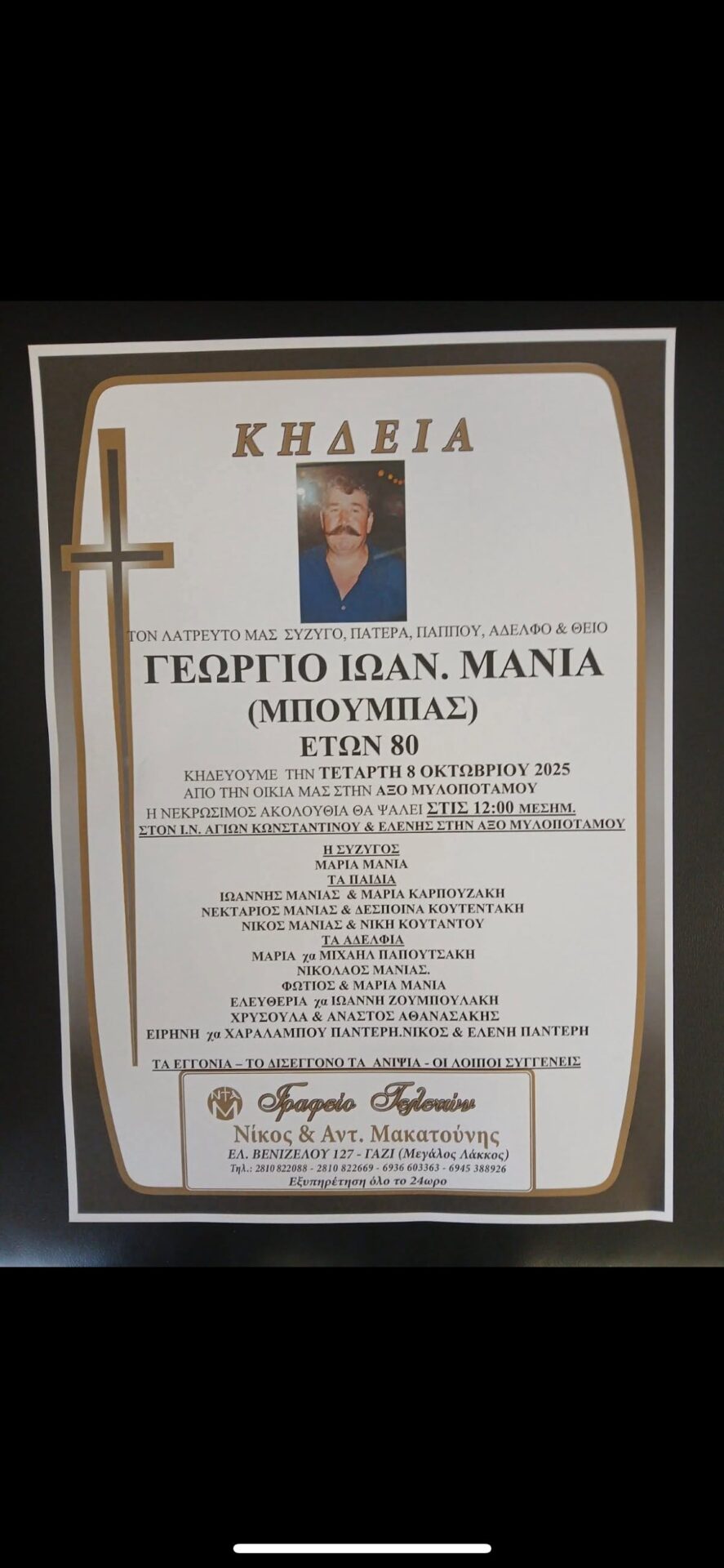 - Η κηδεία θα τελεστεί στον Ιερό Ναό Αγίων Κωσταντίνου και Ελένης στην Αξό Μυλοποτάμου.