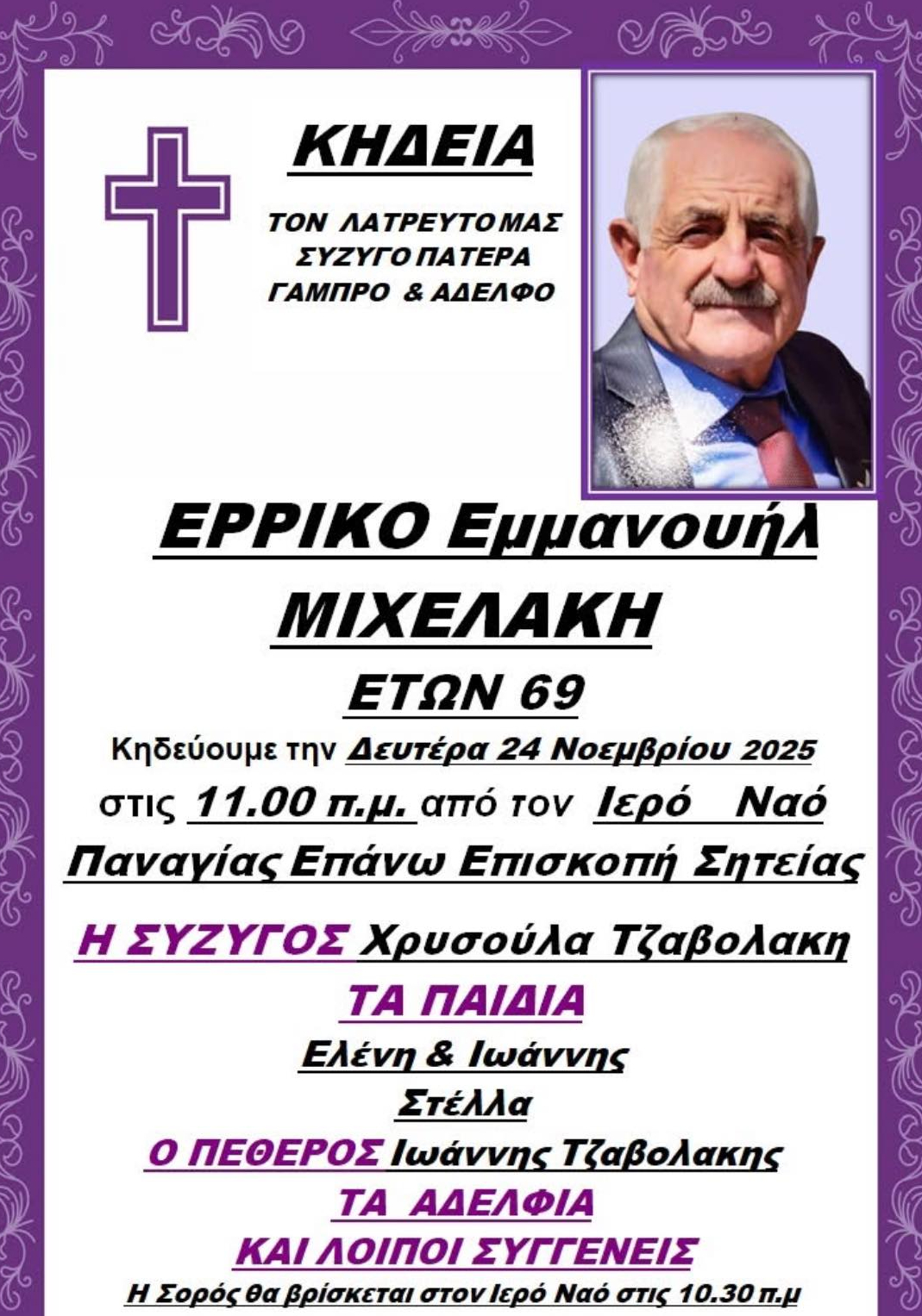 Θλίψη για την τοπική κοινωνία της Ιεράπετρας για τον θάνατο του Ερρίκου Εμμανουήλ Μιχελάκη ο οποιός έφυγε από την ζωή σε ηλικία 69 ετών.