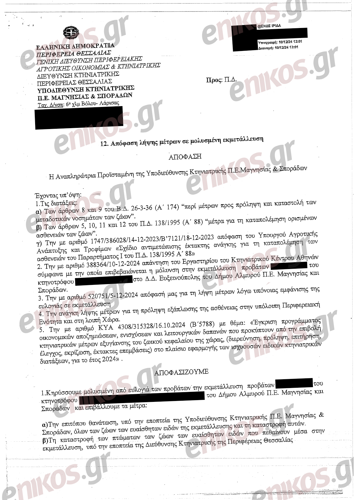 Η απόφαση για θανάτωση των ζώων του συγκεκριμένου κτηνοτρόφου ελήφθη από την Υποδιεύθυνση Κτηνιατρικής Π.Ε. Μαγνησίας και Σποράδων. Όπως αναφέρεται στο έγγραφο που δημοσιεύει το enikos.gr, «κηρύσσεται μολυσμένη από ευλογιά η εκμετάλλευση προβάτων του κτηνοτρόφου Γ. Τ. στην Ευξεινούπολη του Δήμου Αλμυρού Μαγνησίας» και αποφασίζονται: