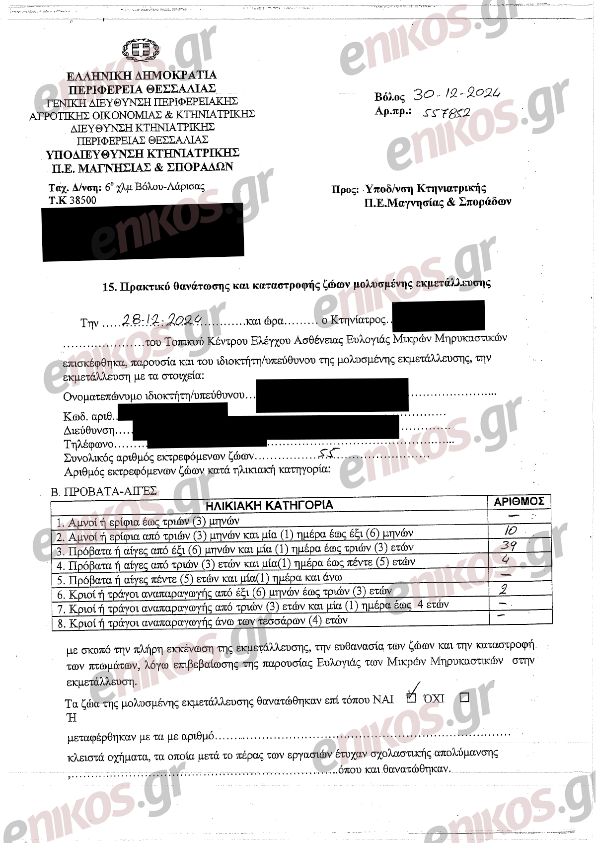 Μάλιστα, στο πρακτικό της Περιφέρειας Θεσσαλίας φαίνεται και η ημερομηνία θανάτωσης, – στις 28 Δεκεμβρίου 2024 – αλλά και ο συνολικός αριθμός των ζώων που εντοπίστηκαν μολυσμένα και θανατώθηκαν (55).