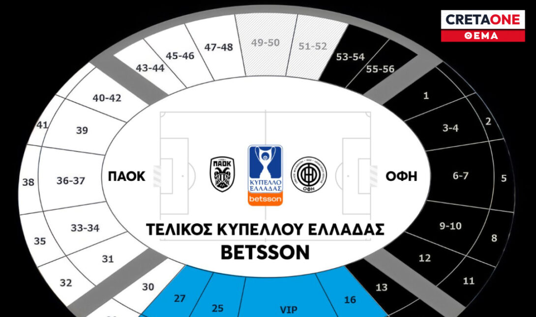 Λίγες ημέρες μετά τη σύσκεψη για τη διάθεση των εισιτηρίων, απόφαση της οποία ήταν να διατεθούν 7.872 εισιτήρια σε κάθε φιναλίστ, έρχεται η ΕΠΟ σε μια πρωτοφανή κίνηση, να υποχρεώσει τον ΟΦΗ να διαθέσει μέχρι 10 Απριλίου τα 6.800 εισιτήρια που αναλογούν στις θύρες 1 έως 12 και 13, 14, 17, για να μπορεί να πάρει και τα υπόλοιπα 100ο που του αναλογούν για τις θύρες 53, 54, 55 και 56 του Πανθεσσαλικού.