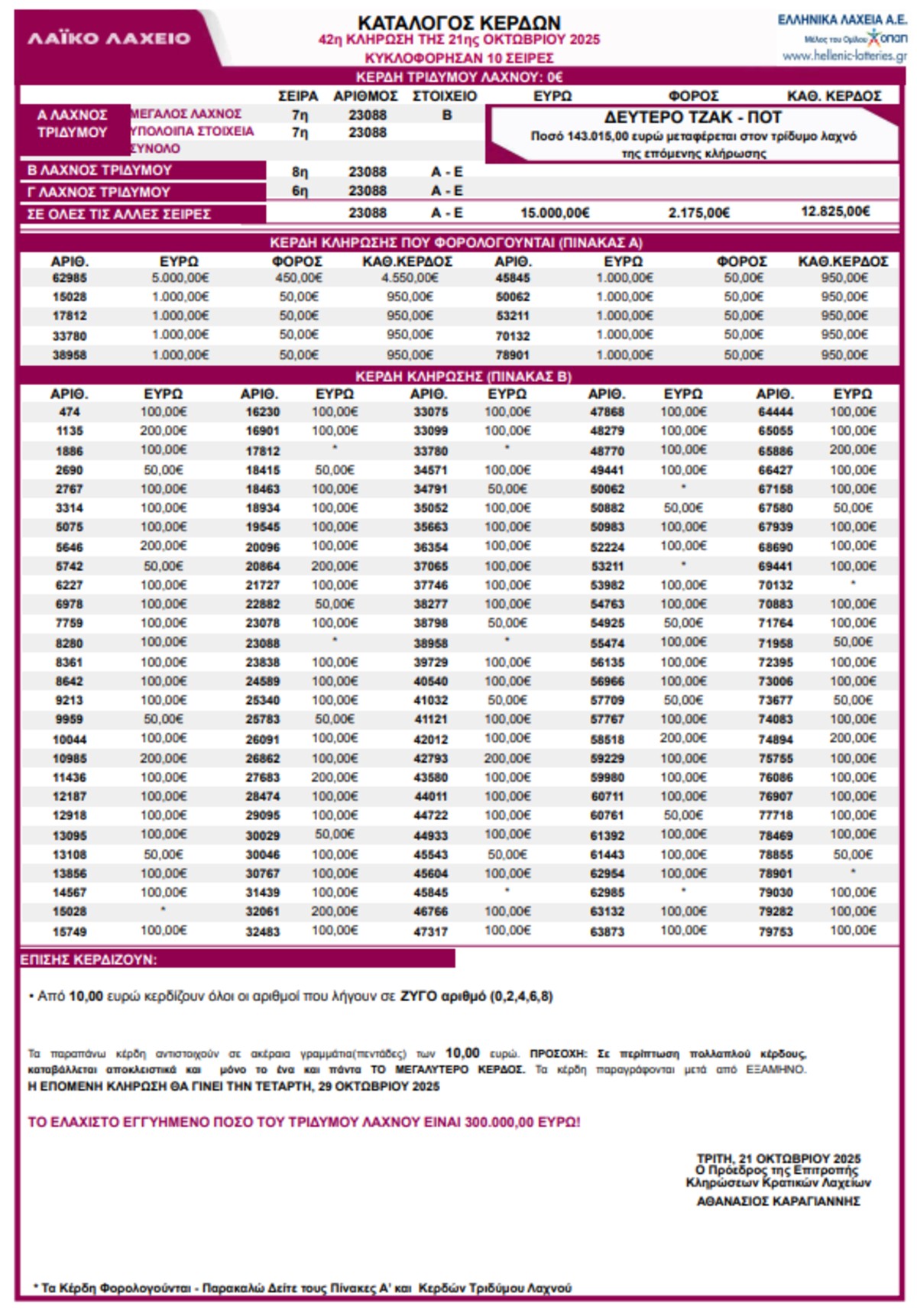 - Η κλήρωση του Λαϊκού Λαχείου στις 21/10/2025 μοίρασε 2.080.000 ευρώ με τον τυχερό αριθμό 23088, σειρά 7η, στοιχείο Β.