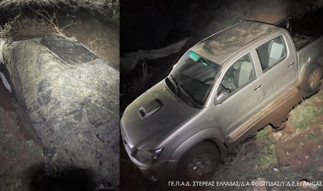 Τελικά οι δράστες κατάφεραν να φύγουν για Φάρσαλα με ένα Toyota Hilux Tornado 4Χ4, το οποίο οι αστυνομικοί εντόπισαν κρυμμένο σε ένα αυλάκι, σκεπασμένο με μουσαμά και καλυμμένο από πάνω με χώμα και ξύλα!