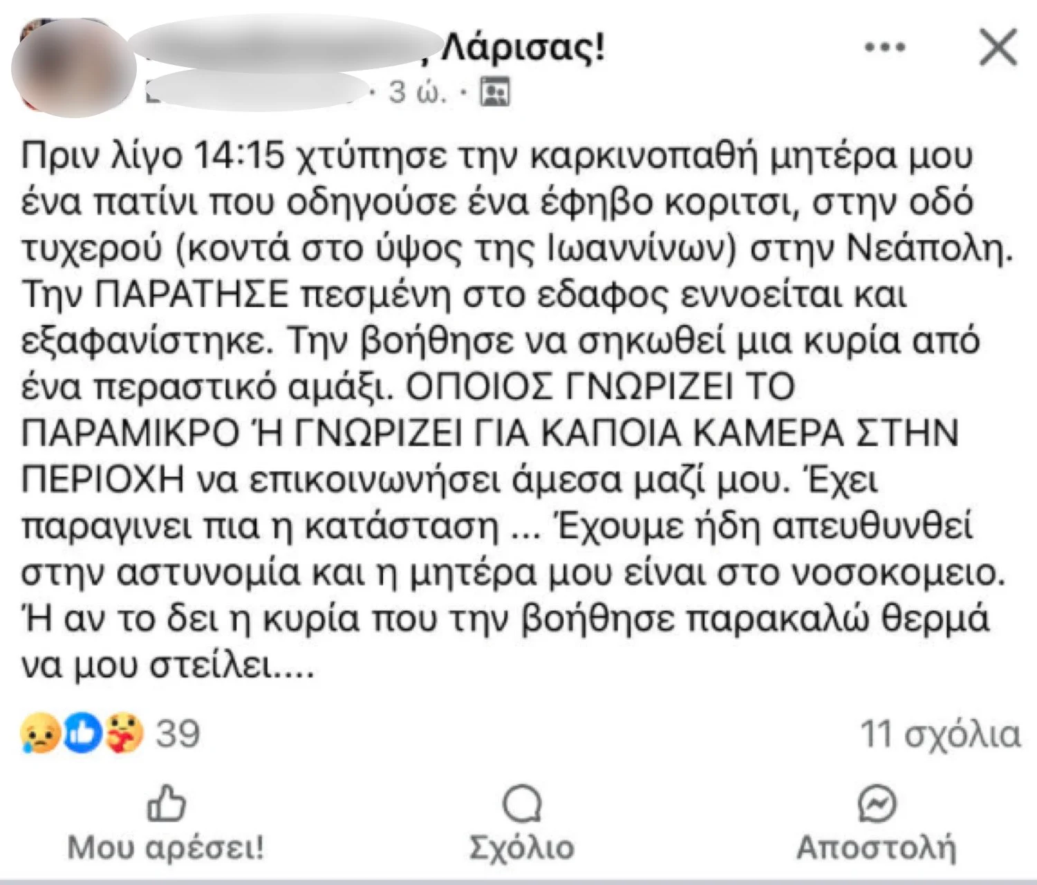 «Πριν λίγο 14:15 (σ.σ. χθες Δευτέρα) χτύπησε την καρκινοπαθή μητέρα μου ένα πατίνι που οδηγούσε ένα έφηβο κορίτσι, στην οδό τυχερού (κοντά στο ύψος της Ιωαννίνων) στη Νεάπολη. Την ΠΑΡΑΤΗΣΕ πεσμένη στο έδαφος εννοείται και εξαφανίστηκε. Την βοήθησε να σηκωθεί μια κυρία από ένα περαστικό αμάξι. ΟΠΟΙΟΣ ΓΝΩΡΙΖΕΙ ΤΟ ΠΑΡΑΜΙΚΡΟ Ή ΓΝΩΡΙΖΕΙ ΓΙΑ ΚΑΠΟΙΑ ΚΑΜΕΡΑ ΣΤΗΝ ΠΕΡΙΟΧΗ να επικοινωνήσει άμεσα μαζί μου. Έχει παραγίνει πια η κατάσταση … Έχουμε ήδη απευθυνθεί στην αστυνομία και η μητέρα μου είναι στο νοσοκομείο. Ή αν το δει η κυρία που την βοήθησε παρακαλώ θερμά να μου στείλει».
