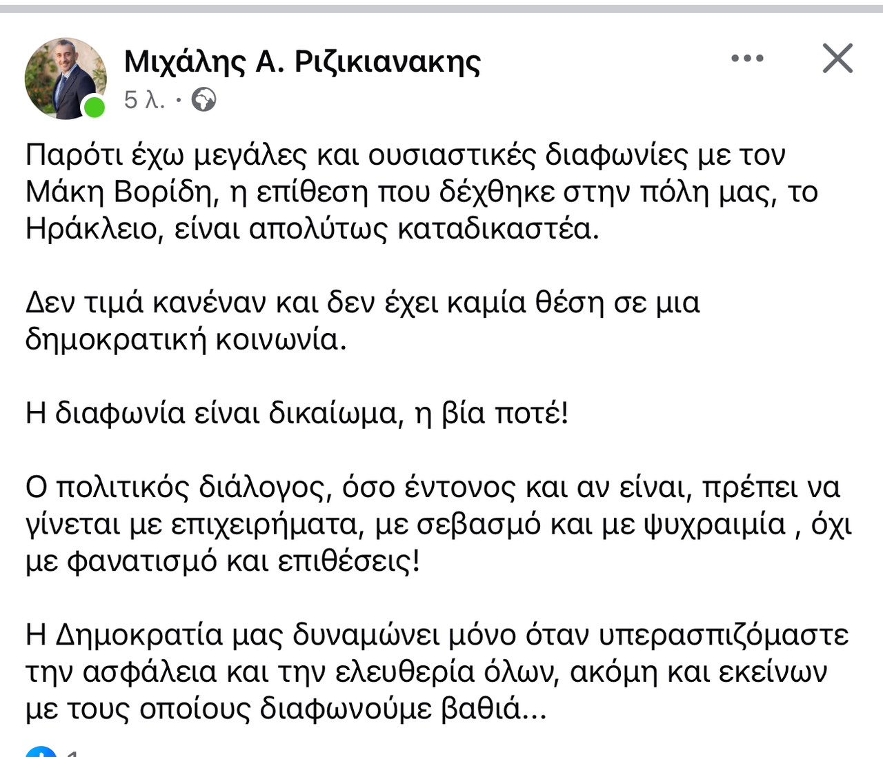 Σε ανάρτησή του στα μέσα κοινωνικής δικτύωσης, ο κ. Ριζικιανάκης τόνισε ότι, παρά τις «μεγάλες και ουσιαστικές διαφωνίες» που έχει με τον κ. Βορίδη, η επίθεση είναι «απολύτως καταδικαστέα». Όπως σημείωσε, «η διαφωνία είναι δικαίωμα, η βία ποτέ».