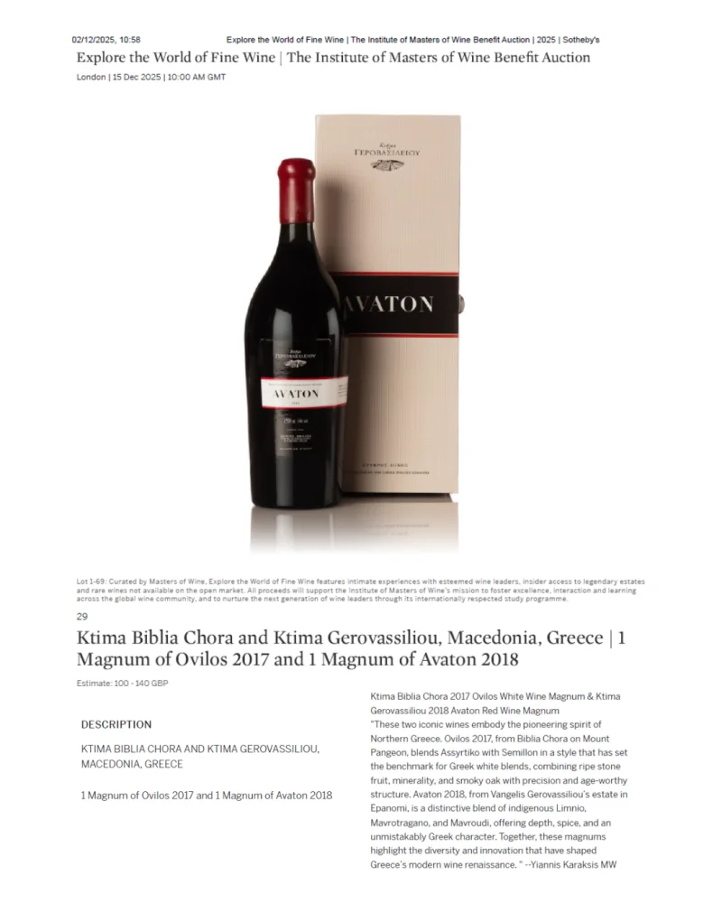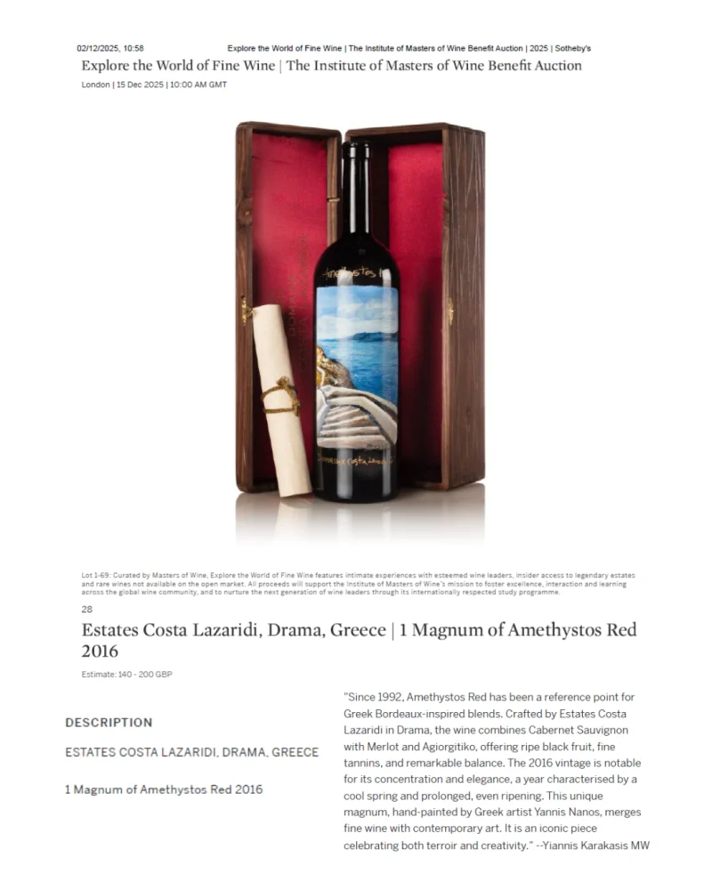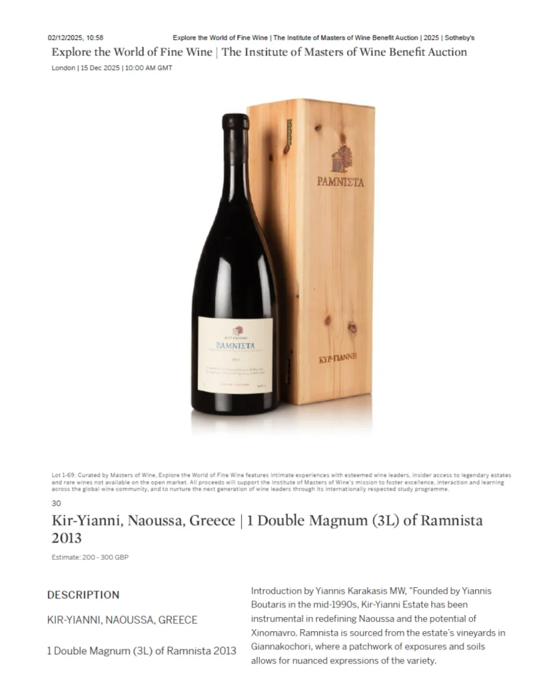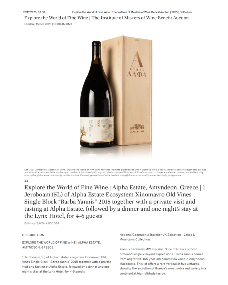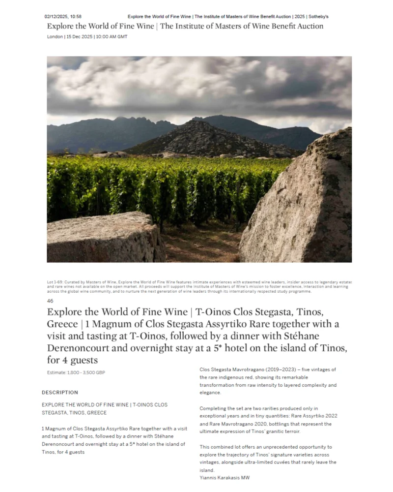 Πρόκειται για το «Explore the World of Fine Wine 2025 / The Institute of Masters of Wine Benefit Auction», μια σημαντική δημοπρασία που διοργανώνεται από το Institute of Masters of Wine (IMW) σε συνεργασία με τον οίκο Sotheby’s και ανοιχτές προσφορές έως και τις 15 Δεκεμβρίου.