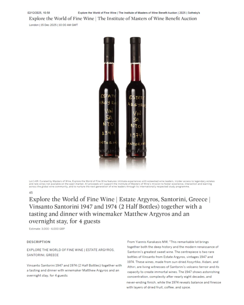 «Αυτή η αξιόλογη παρτίδα κρασιών ενώνει τόσο τη βαθιά ιστορία όσο και τη σύγχρονη αναγέννηση του σπουδαιότερου γλυκού κρασιού της Σαντορίνης. Το κεντρικό κομμάτι είναι δύο σπάνιες φιάλες Vinsanto από το Κτήμα Αργυρού, των σοδειών 1947 και 1974.