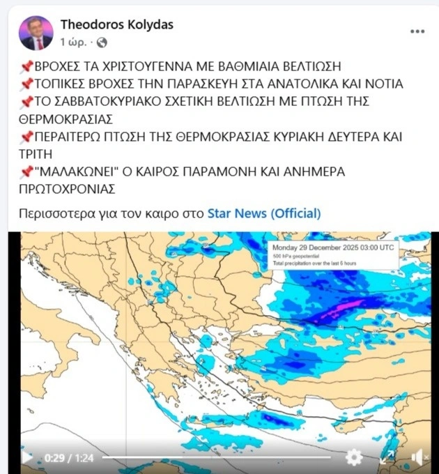 Βροχερό θα είναι το σκηνικό του καιρού τα Χριστούγεννα με βαθμιαία βελτίωση στη πορεία της ημέρας, σύμφωνα με την πρόγνωση του Θοδωρή Κολυδά.