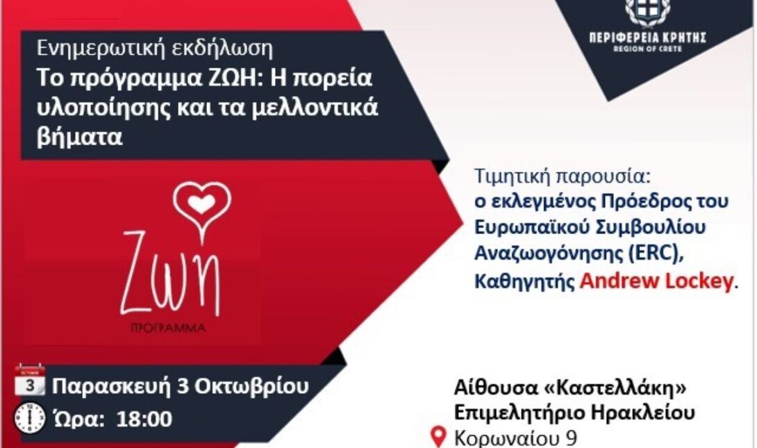 Η Περιφέρεια Κρήτης διοργανώνει ενημερωτική εκδήλωση με τίτλο «Το πρόγραμμα ΖΩΗ: Η πορεία υλοποίησης και τα μελλοντικά βήματα», την Παρασκευή 3 Οκτωβρίου 2025 και ώρα 18:00, στην αίθουσα «Καστελλάκη» του Επιμελητηρίου Ηρακλείου.