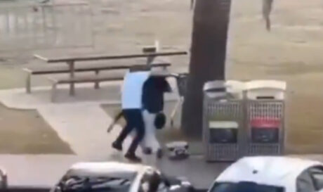 Δευτερόλεπτα αργότερα ο ταύρος κινείται προς την γυναίκα την οποία χτυπάει αρκετές φορές με τα κέρατά του ρίχνοντας την στην άμμο.