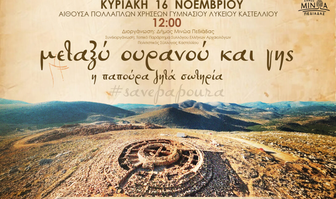Η εκδήλωση θα πραγματοποιηθεί στην Αίθουσα Πολλαπλών Χρήσεων του Λυκείου Καστελλίου, στις 12:00 το μεσημέρι, όπου η επικεφαλής της ανασκαφής, αρχαιολόγος Δανάη Κοντοπόδη, σε συνέχεια της παρουσίασης που είχε πραγματοποιηθεί στις 12 Οκτωβρίου στην Αθήνα, θα παρουσιάσει εκ νέου τα αποτελέσματα της ανασκαφής και την ταυτότητα του Μνημείου, στο ύψωμα Παπούρα, αναδεικνύοντας την αρχαιολογική σημασία και αξία του αλλά και την ανάγκη προστασίας και ανάδειξης του.