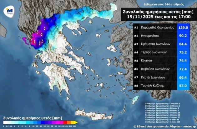 Σύμφωνα με τις καταγραφές του δικτύου αυτόματων μετεωρολογικών σταθμών του meteo.gr / Εθνικού Αστεροσκοπείου Αθηνών το μεγαλύτερο ύψος αθροιστικού υετού έως τις 17:00 καταγράφηκε στην Παραμυθιά Θεσπρωτίας και ήταν ίσο με 139 χιλιοστά.