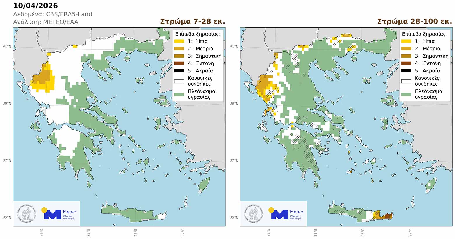 Εικόνα 1. Επίπεδα ξηρασίας στην Ελλάδα κατά την 10η Απριλίου 2026 στα στρώματα υπεδάφους 7-28 εκ. (αριστερά) και 28-100 εκ. (δεξιά)