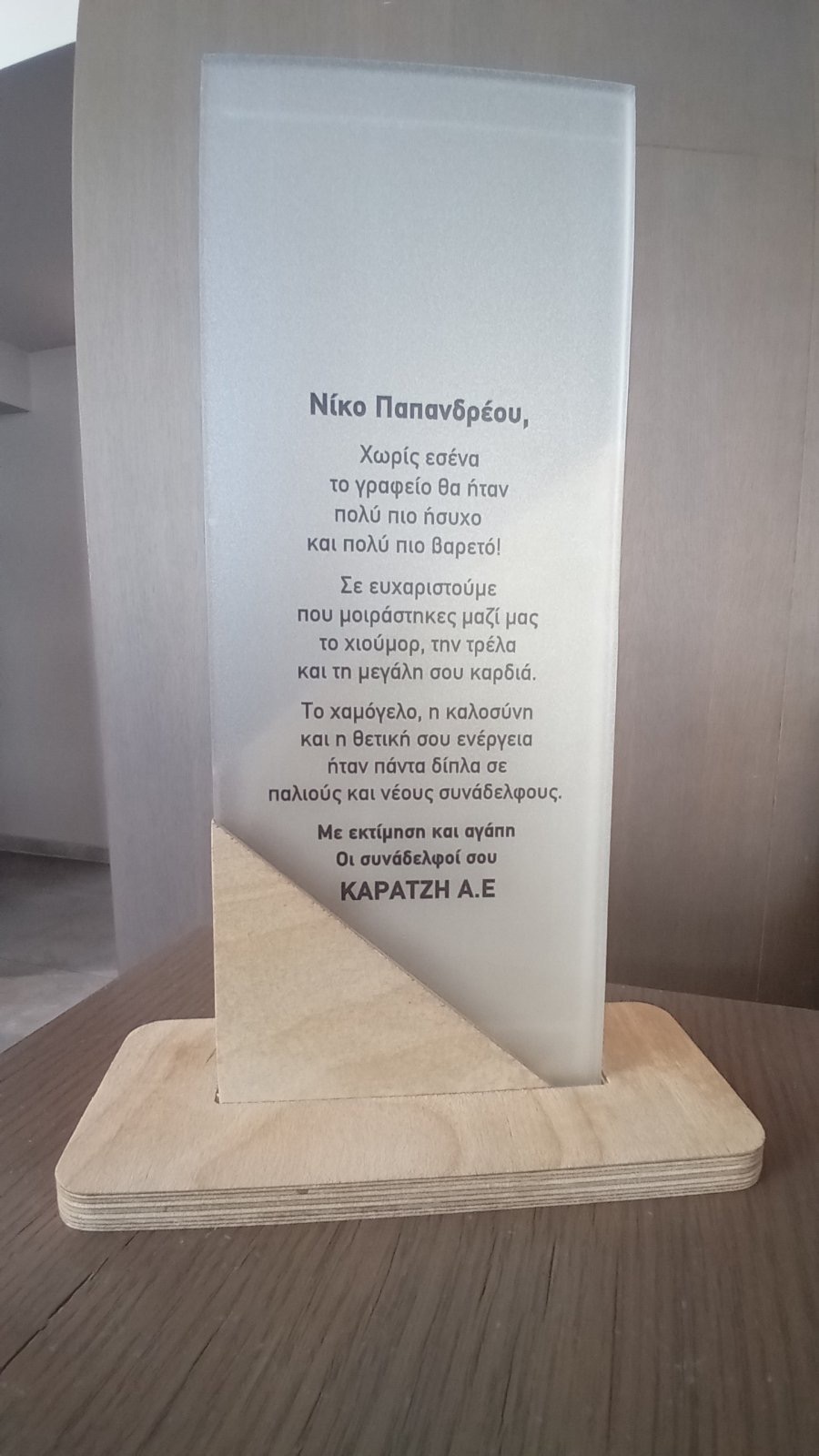 Εκ μέρους των συναδέλφων του, του απονεμήθηκε τιμητική πλακέτα, με λόγια που αποτυπώνουν τη βαθιά εκτίμηση όλων: