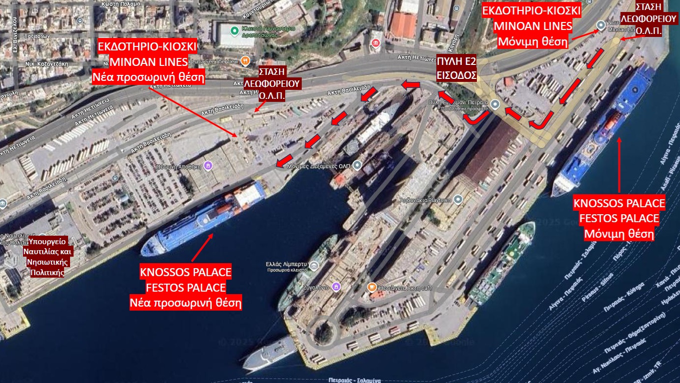 Η MINOAN LINES γνωστοποιεί στο επιβατικό κοινό ότι, λόγω εργασιών εκβάθυνσης του λιμένος Πειραιά, που πραγματοποιεί ο Ο.Λ.Π., από το Σάββατο 11 Οκτωβρίου 2025, τα πλοία της εταιρείας FESTOS PALACE & KNOSSOS PALACE, αντί της μόνιμης θέσης στην Ηετίωνα Ακτή (Πύλη Ε2), θα ελλιμενίζονται προσωρινά, και για σύντομο χρονικό διάστημα, σε νέα θέση, πλησίον της υφιστάμενης, στην Ακτή Βασιλειάδη (Πύλη Ε2), μπροστά από το Υπουργείο Ναυτιλίας και Νησιωτικής Πολιτικής.