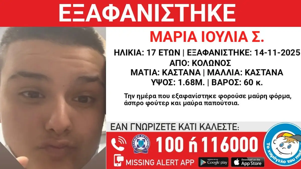 Συναγερμός έχει σημάνει στο «Χαμόγελο του παιδιού», για την εξαφάνιση της17χρονης, Μαρίας Ιουλίας, από χώρο φιλοξενίας στο κέντρο της Αθήνας στις 14/11/2025.